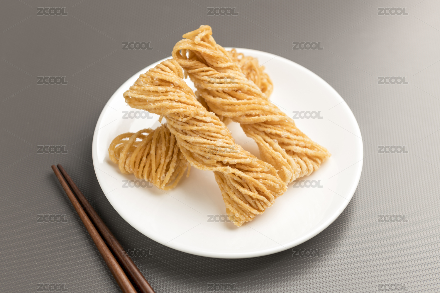 特色小吃一盤油炸馓子擺放在桌面上特寫