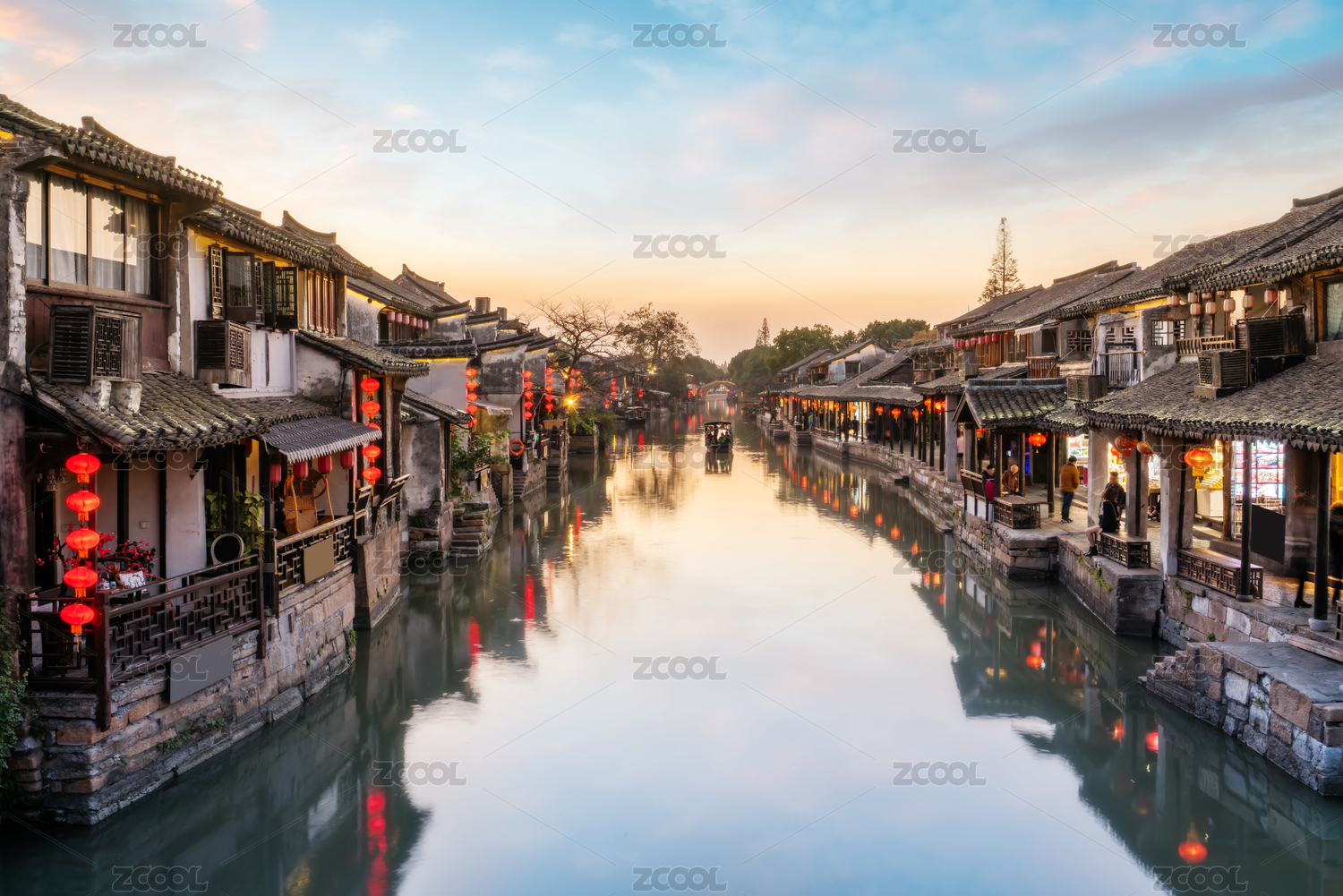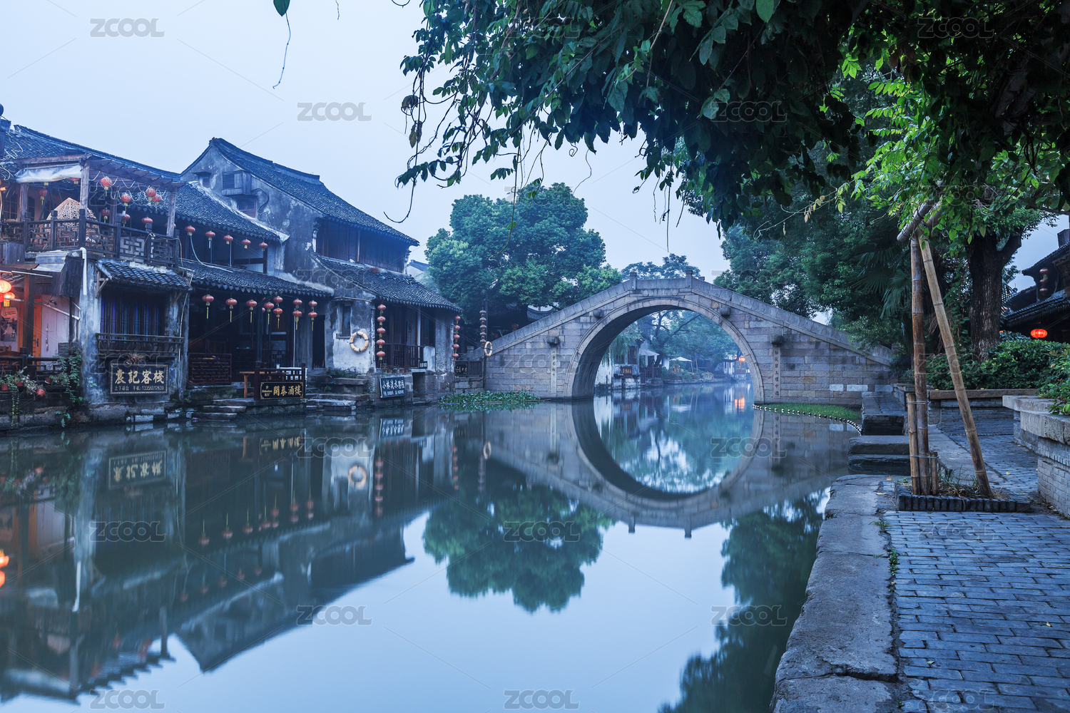 中國浙江杭州西塘古鎮(zhèn)河面倒影映襯古樸建筑夜景