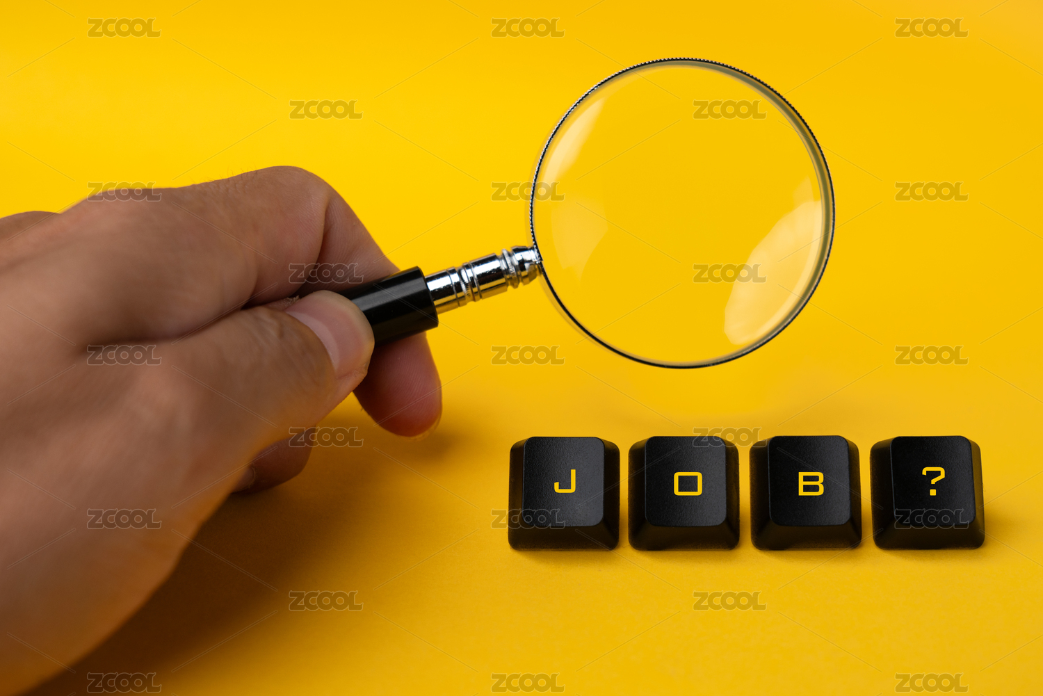 黃色背景下手持放大機和JOB字母微縮創(chuàng)意