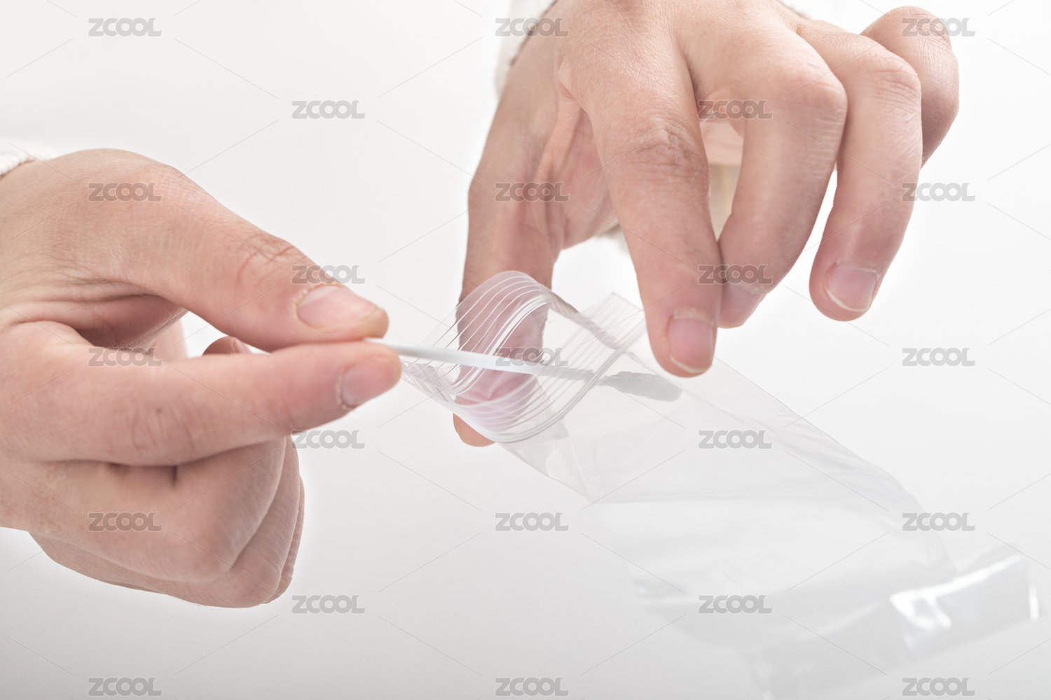 手拿著使用過的鼻咽拭子裝進(jìn)自封袋中