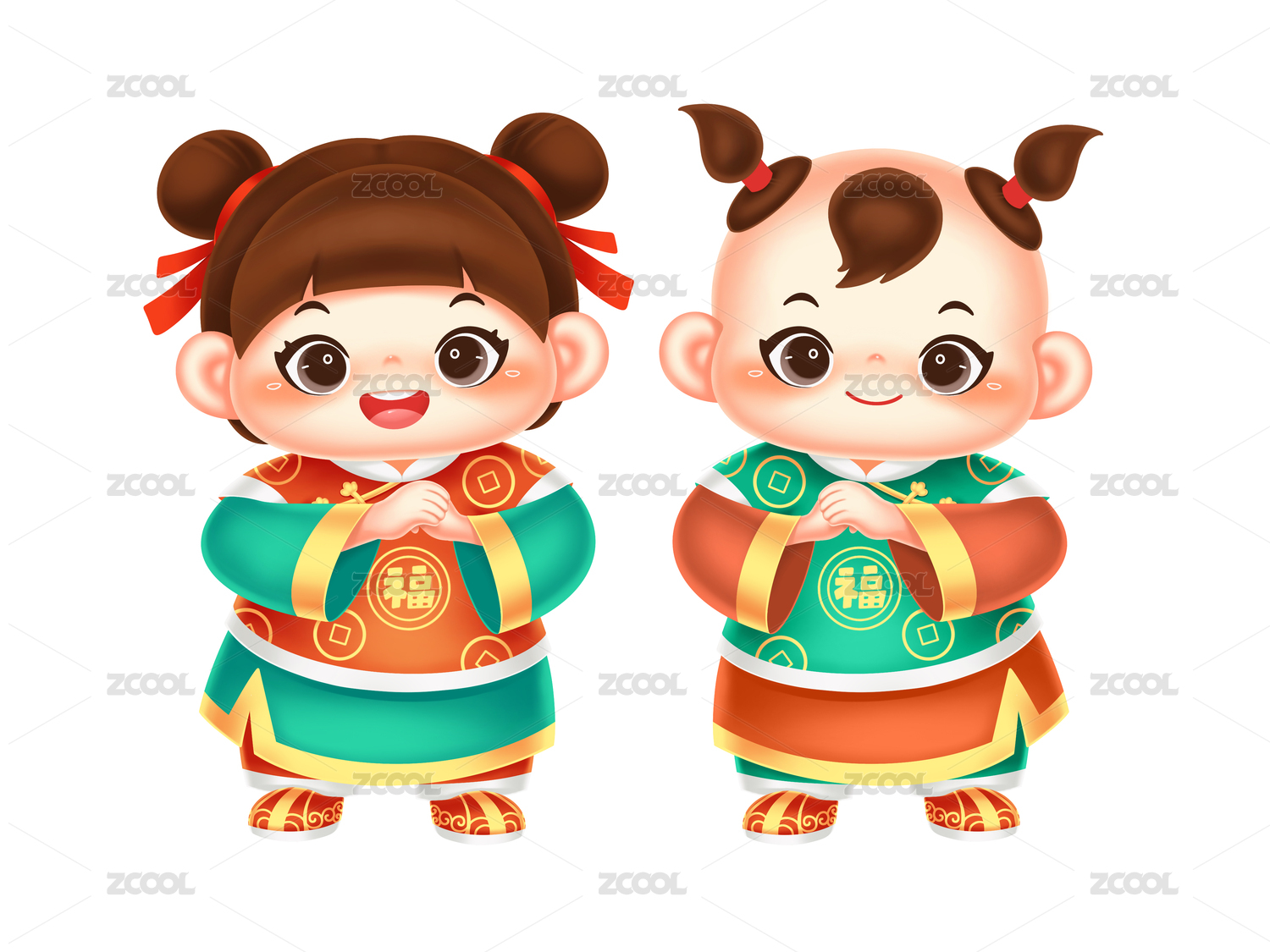 紅色綠色喜慶可愛元旦福娃拜年一對立體