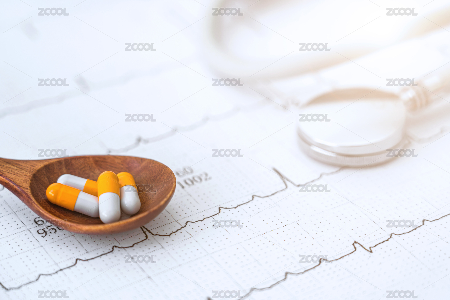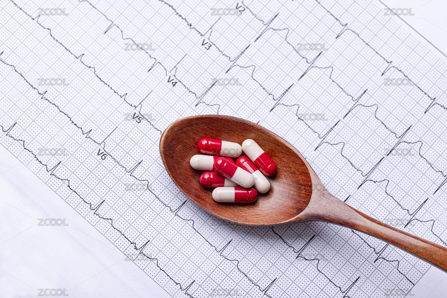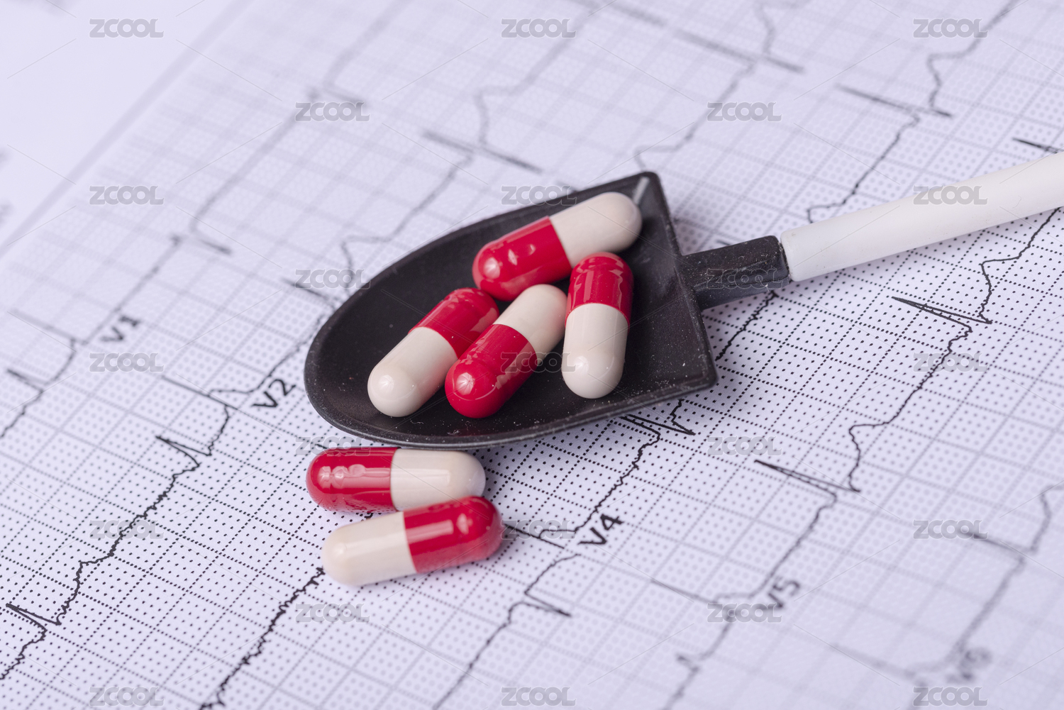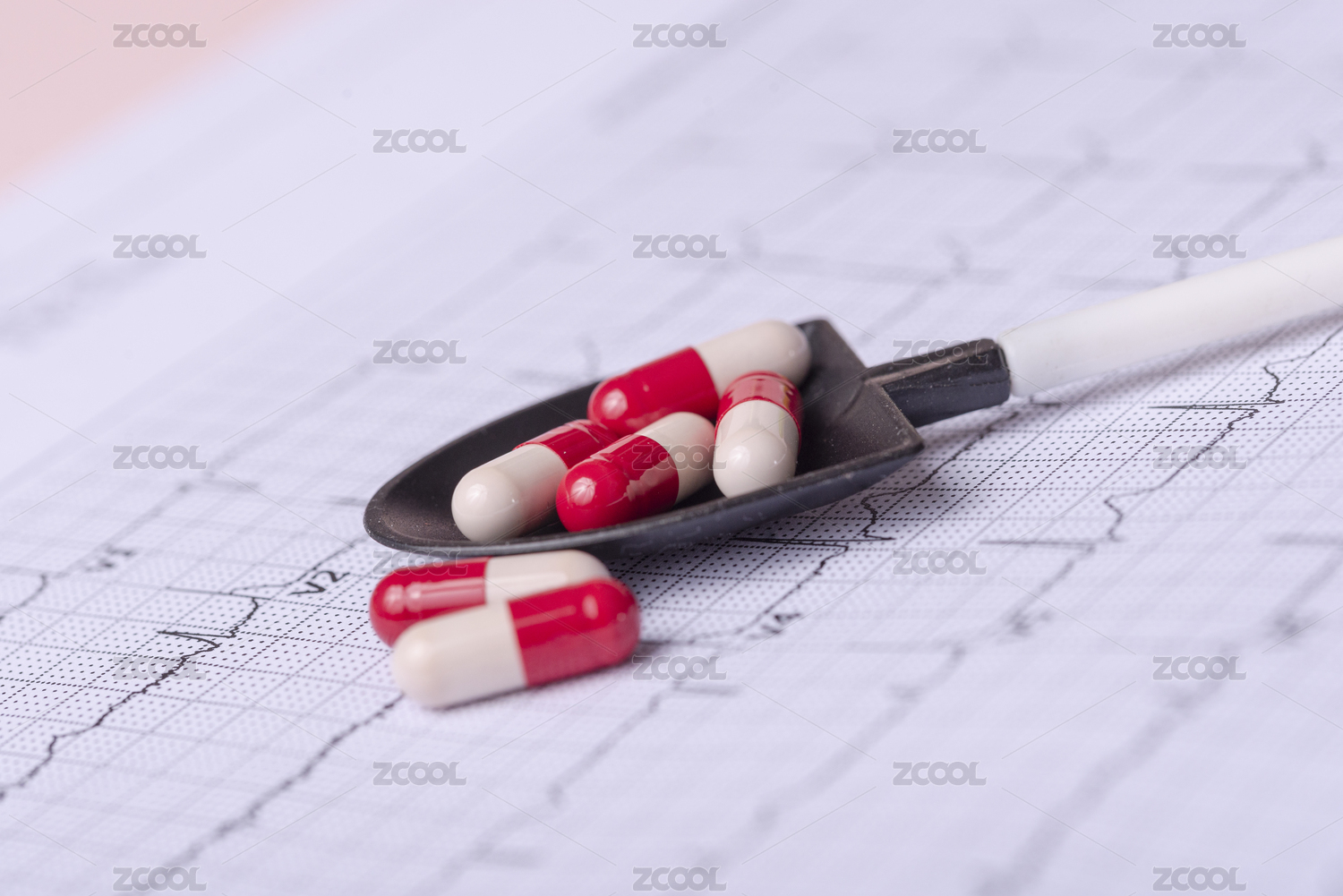 心電圖圖紙上一把木湯匙裝著紅色的膠囊