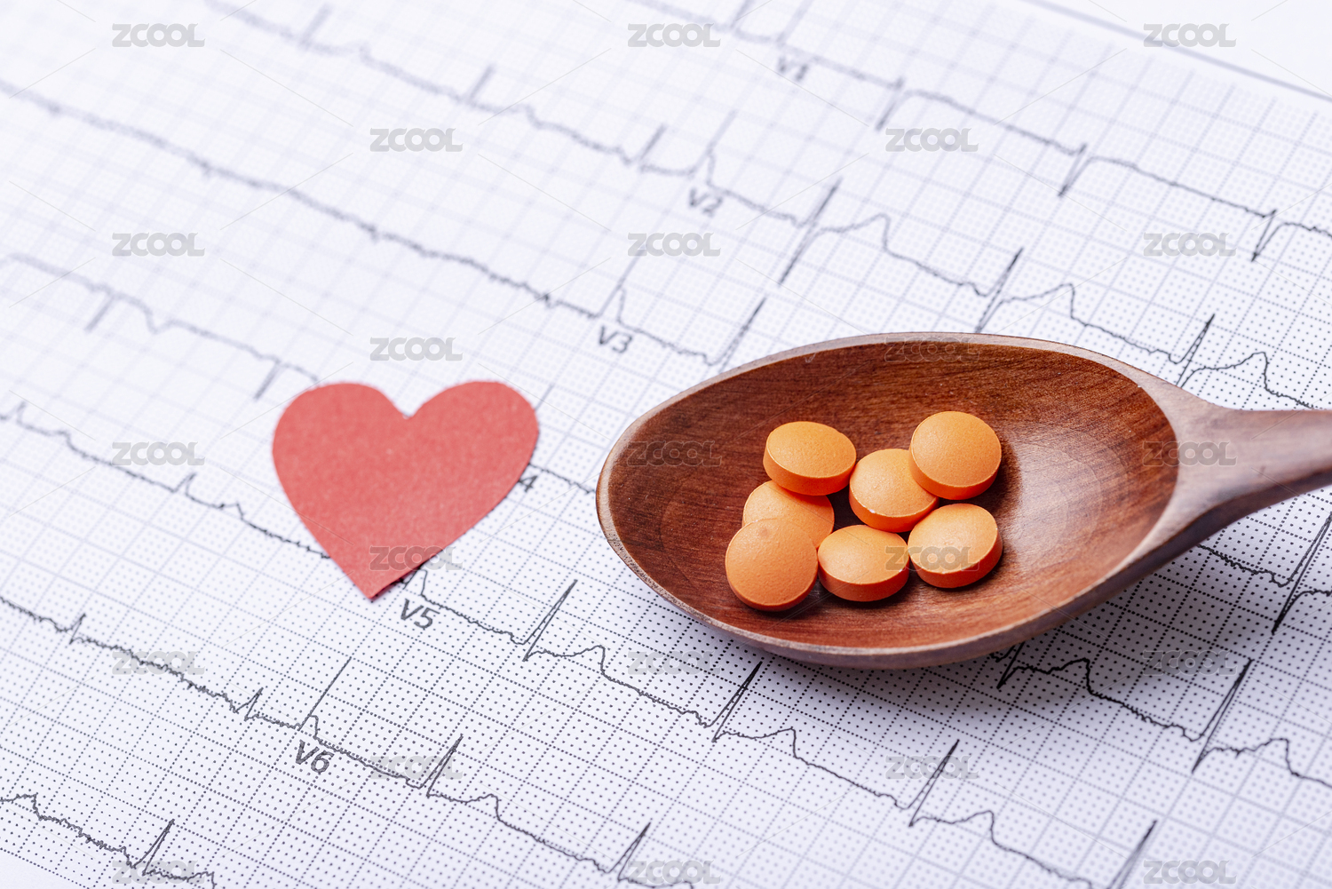 心電圖圖紙上木湯匙里裝的橙色藥片