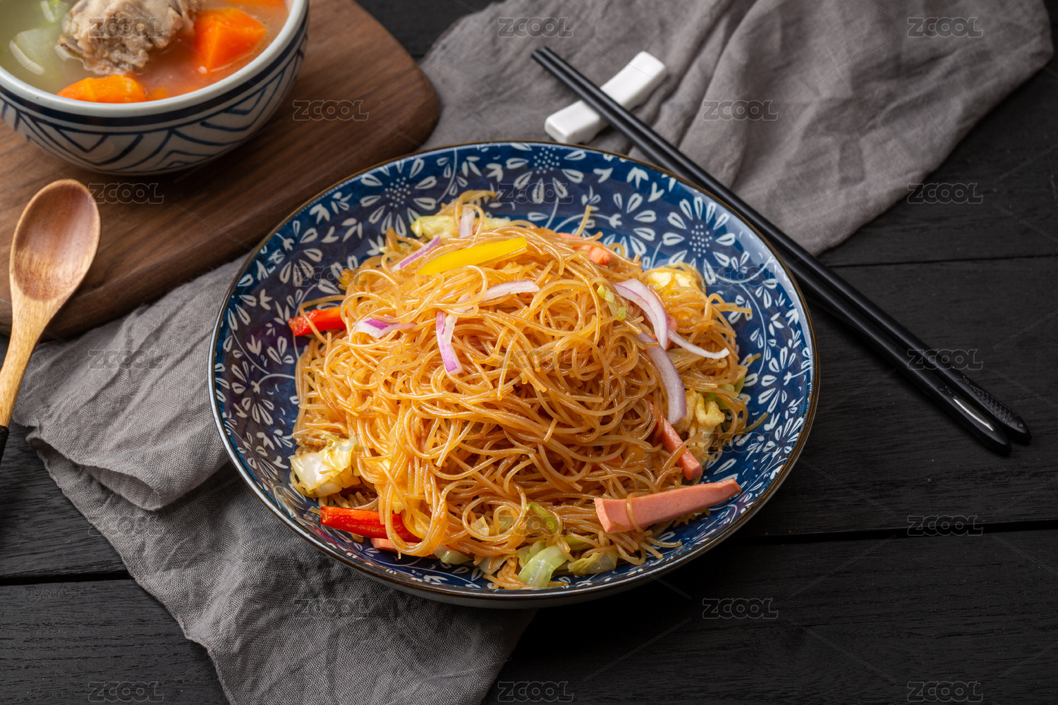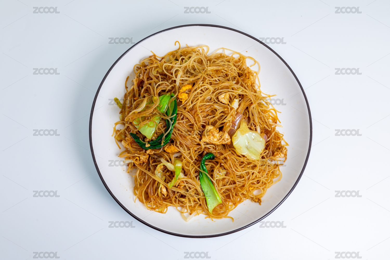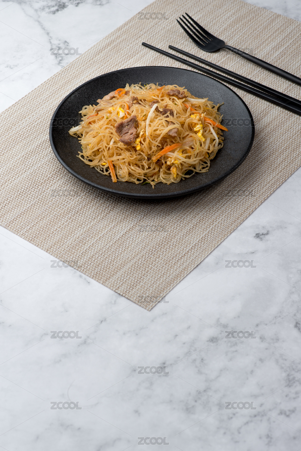 白色大理石桌面上的炒米粉,和旁邊的筷子叉子