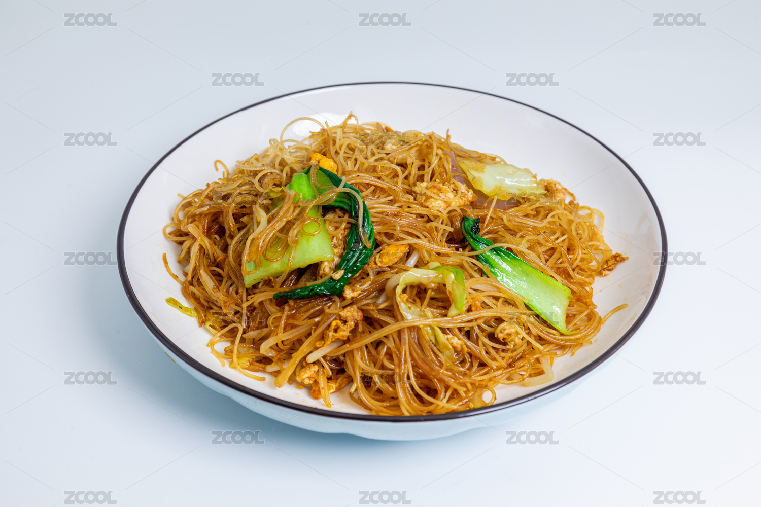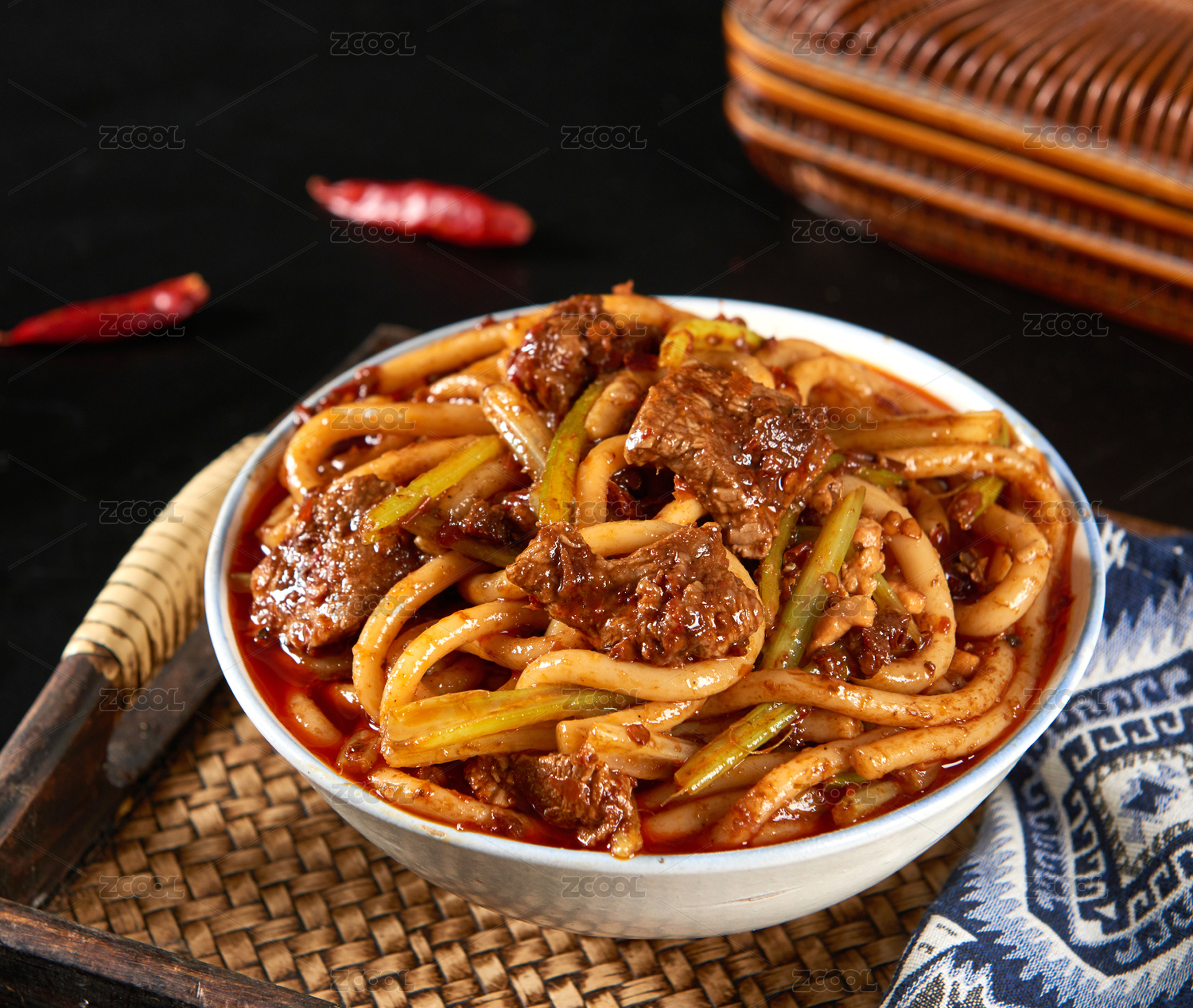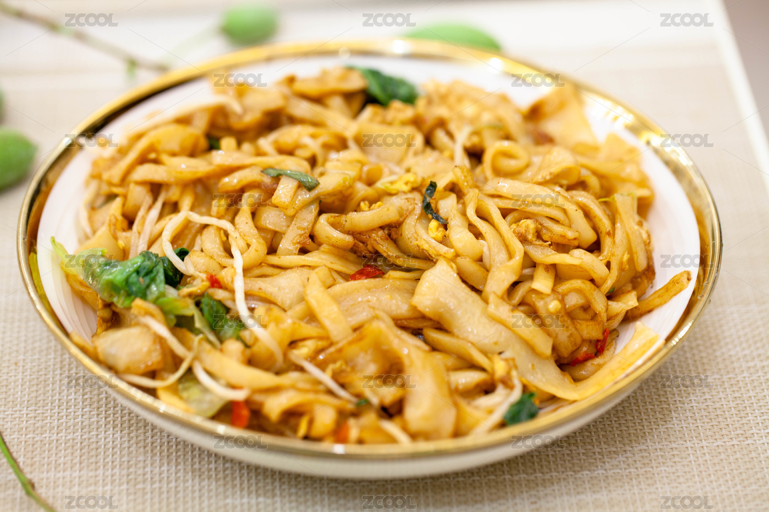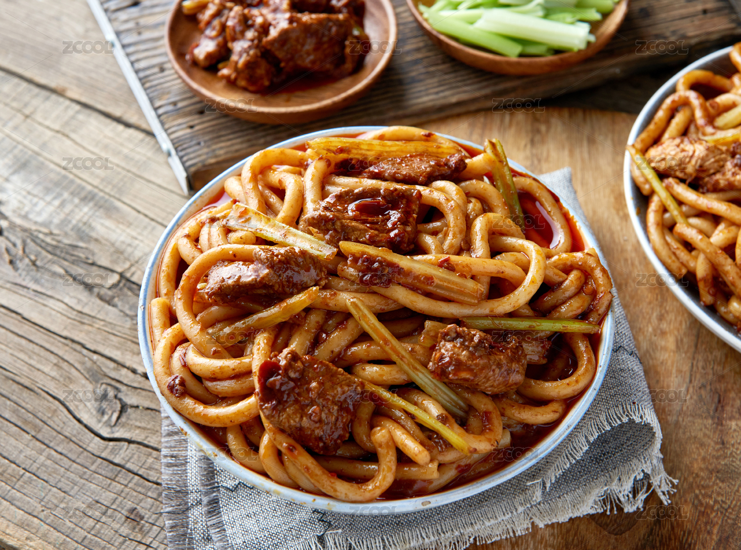 木桌背景下盤中的新疆特色牛肉炒米粉