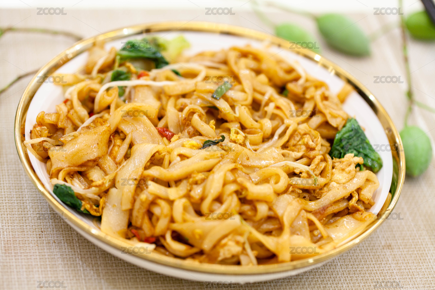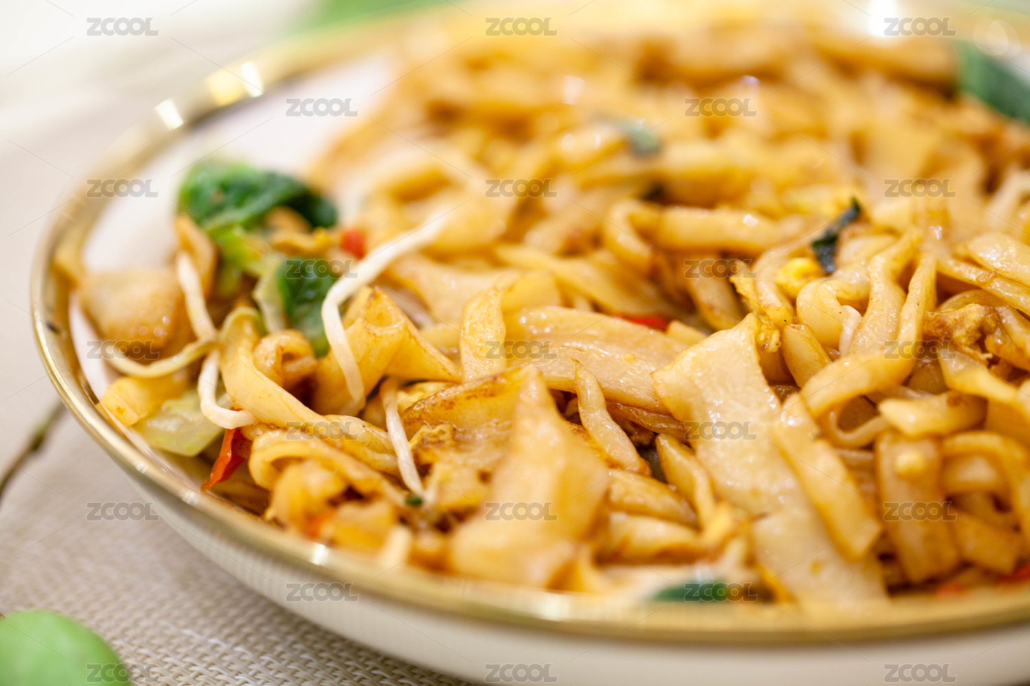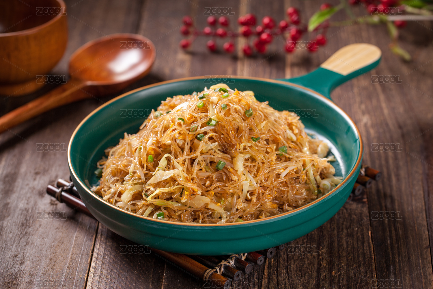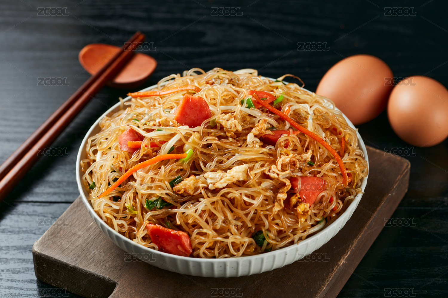 木桌背景下盤中的新疆特色牛肉炒米粉