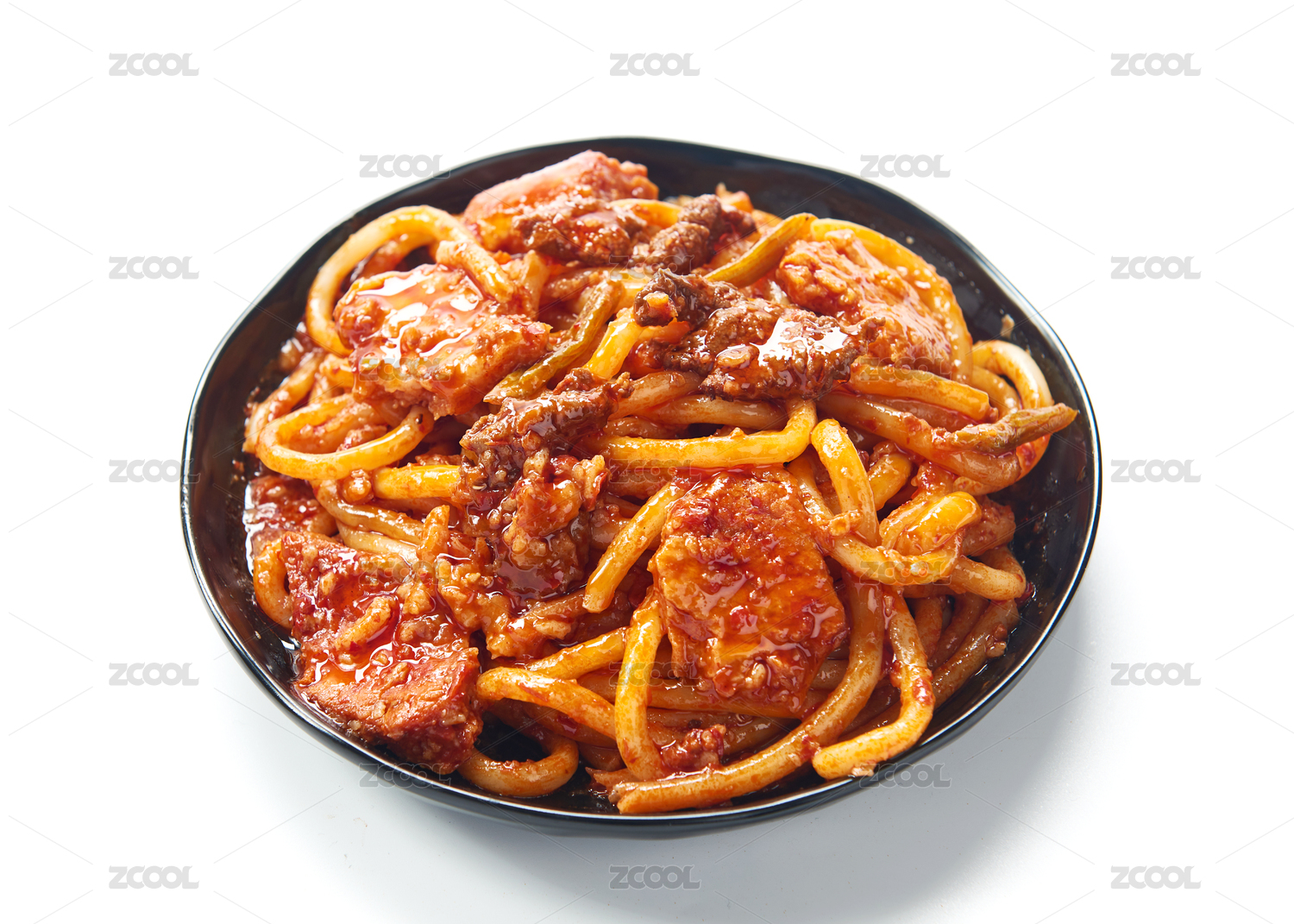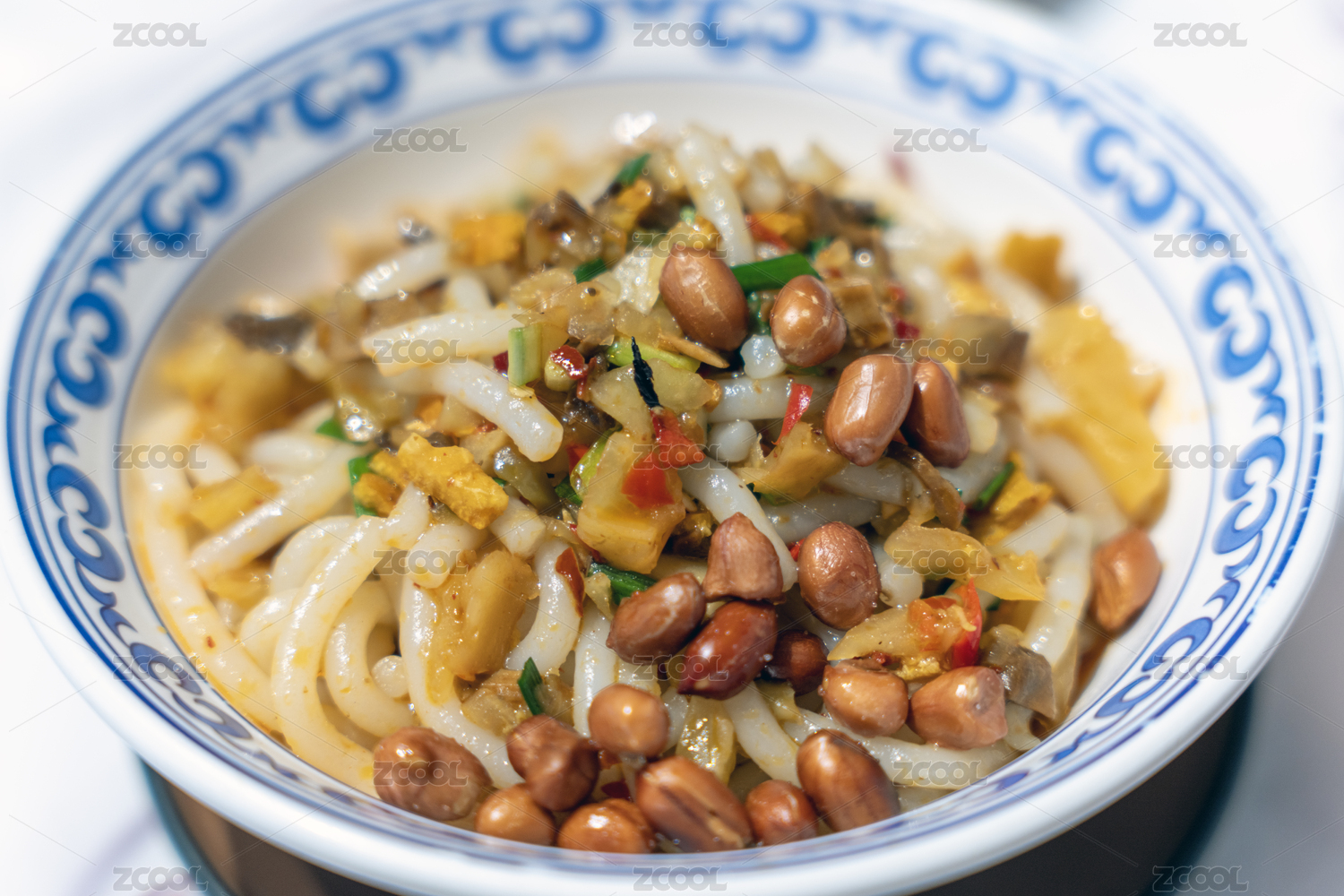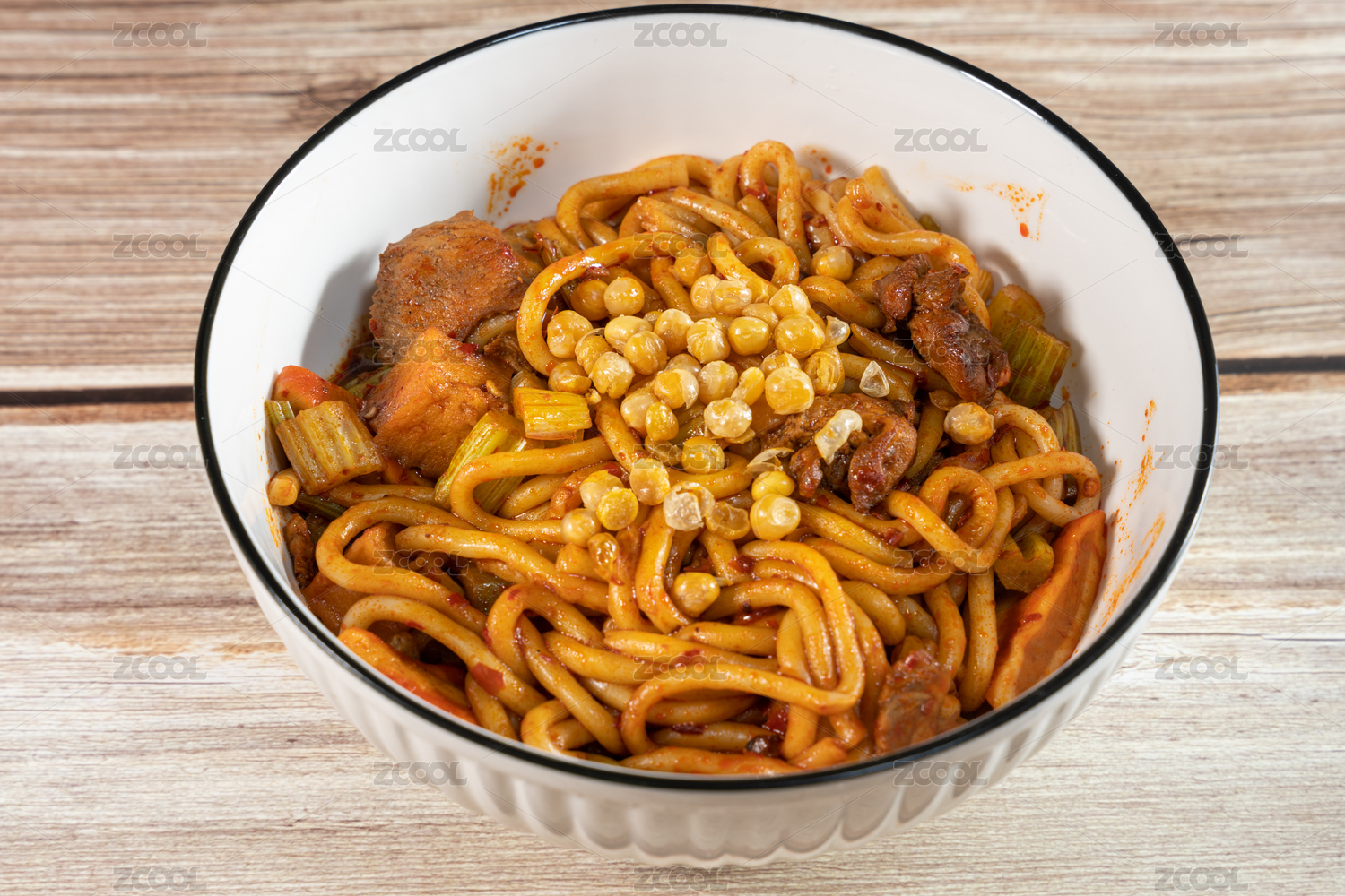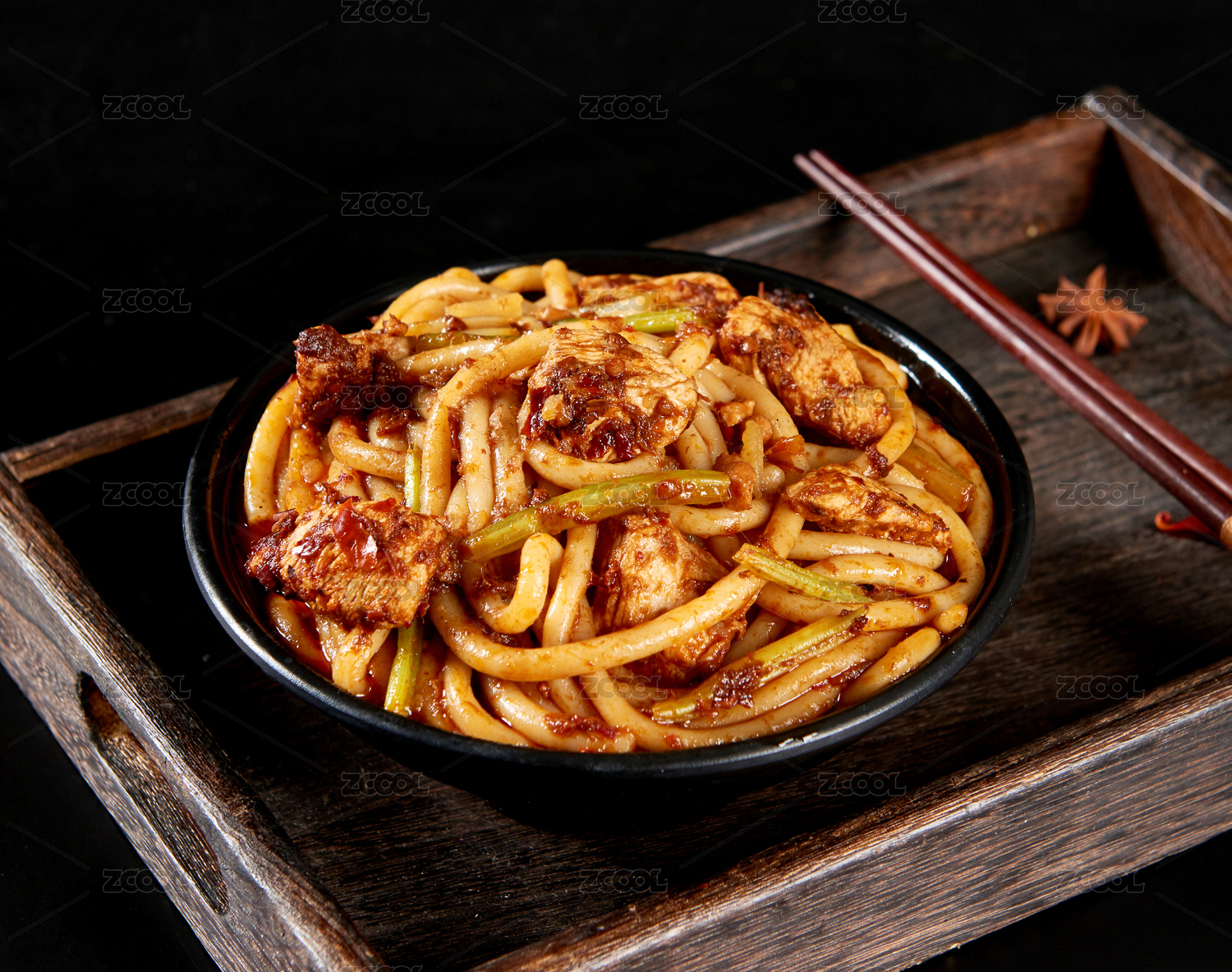 木桌背景下盤中的新疆特色雞肉炒米粉