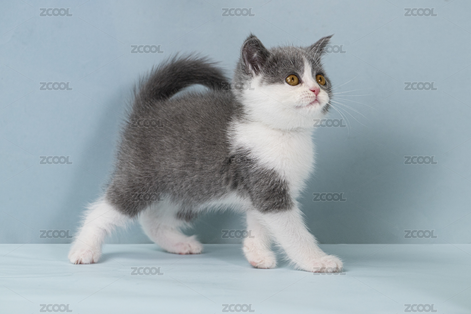 藍(lán)色背景前的藍(lán)白英國短毛貓幼貓