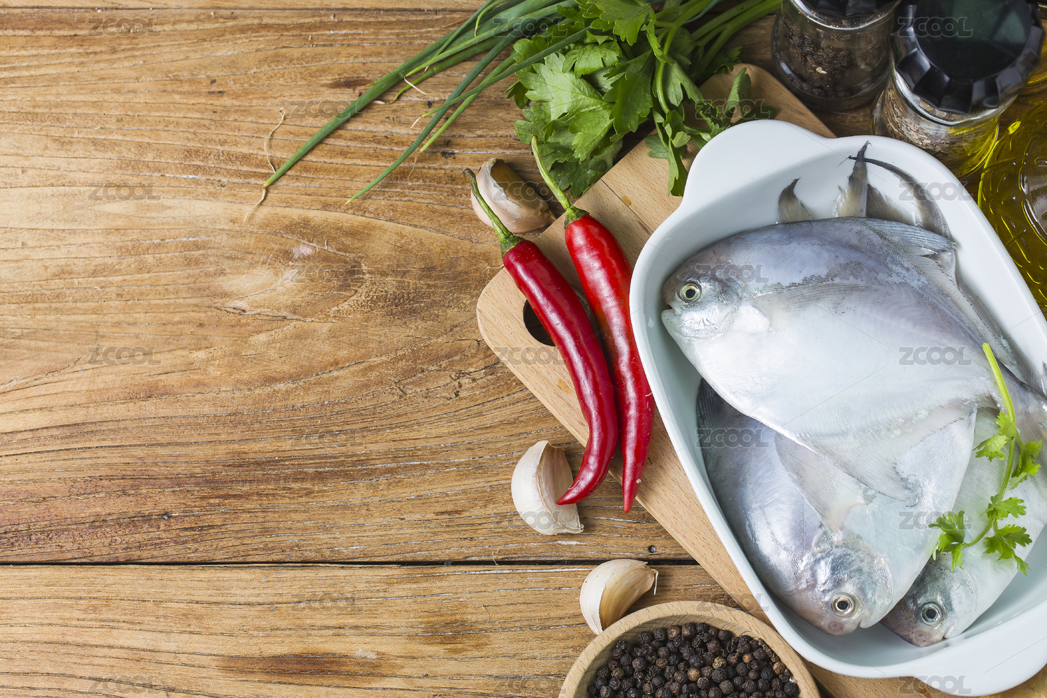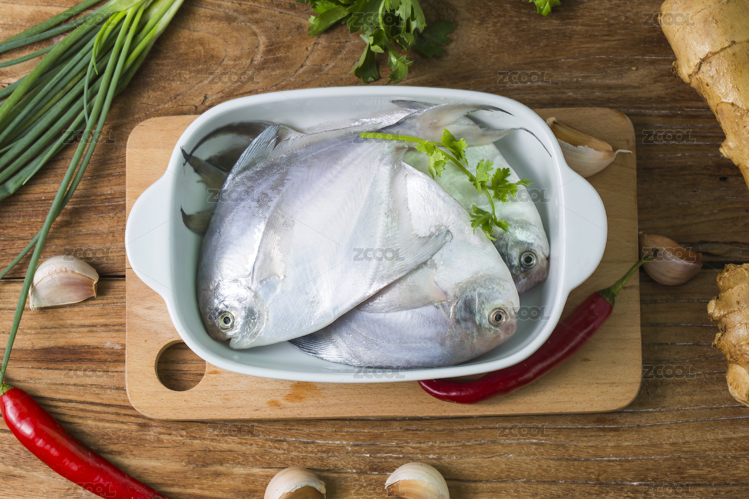 木板背景上新鮮銀鯧魚
