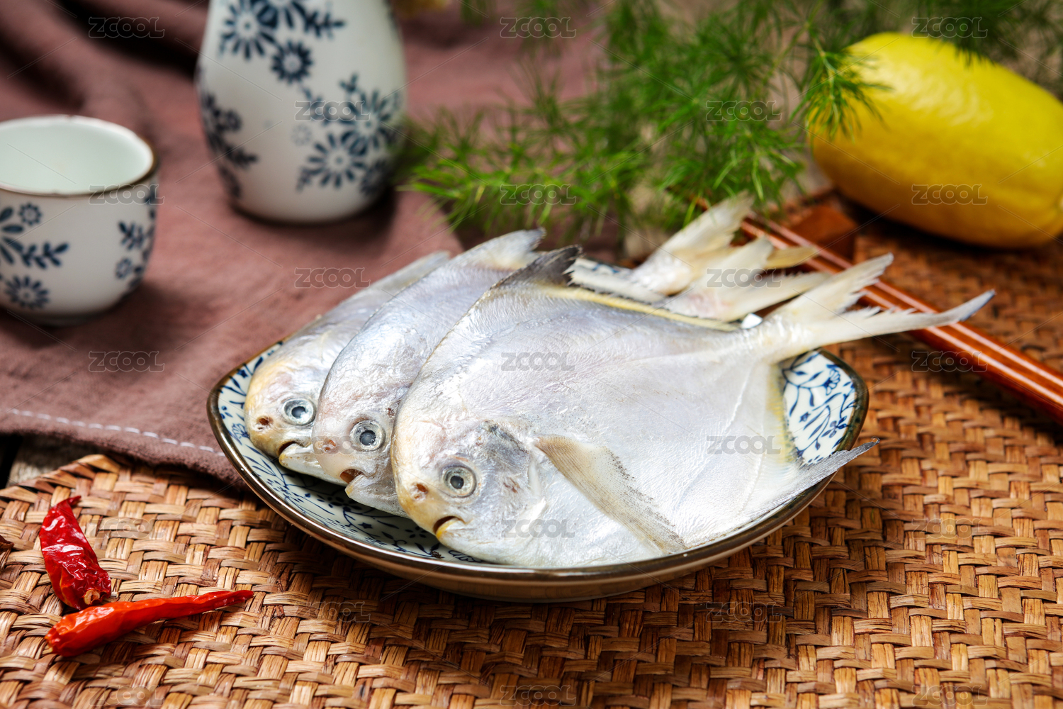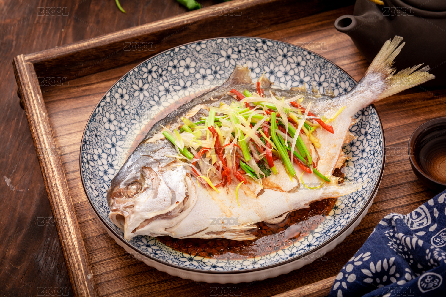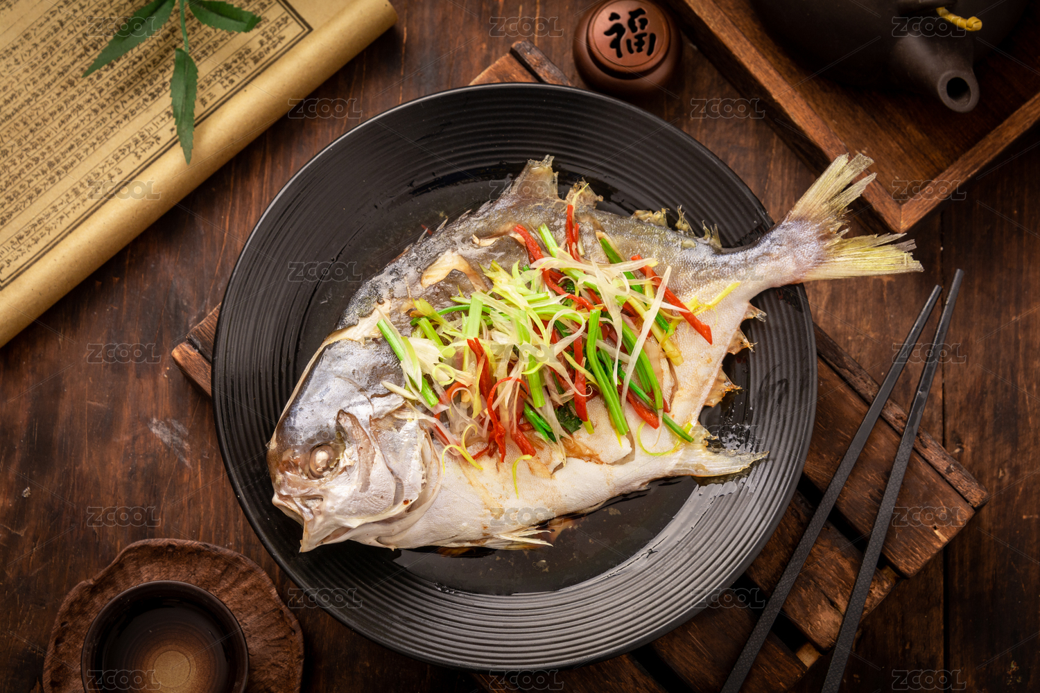 復古中式木紋桌子上的一盤清蒸金鯧魚