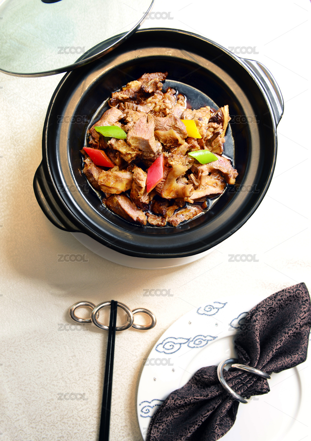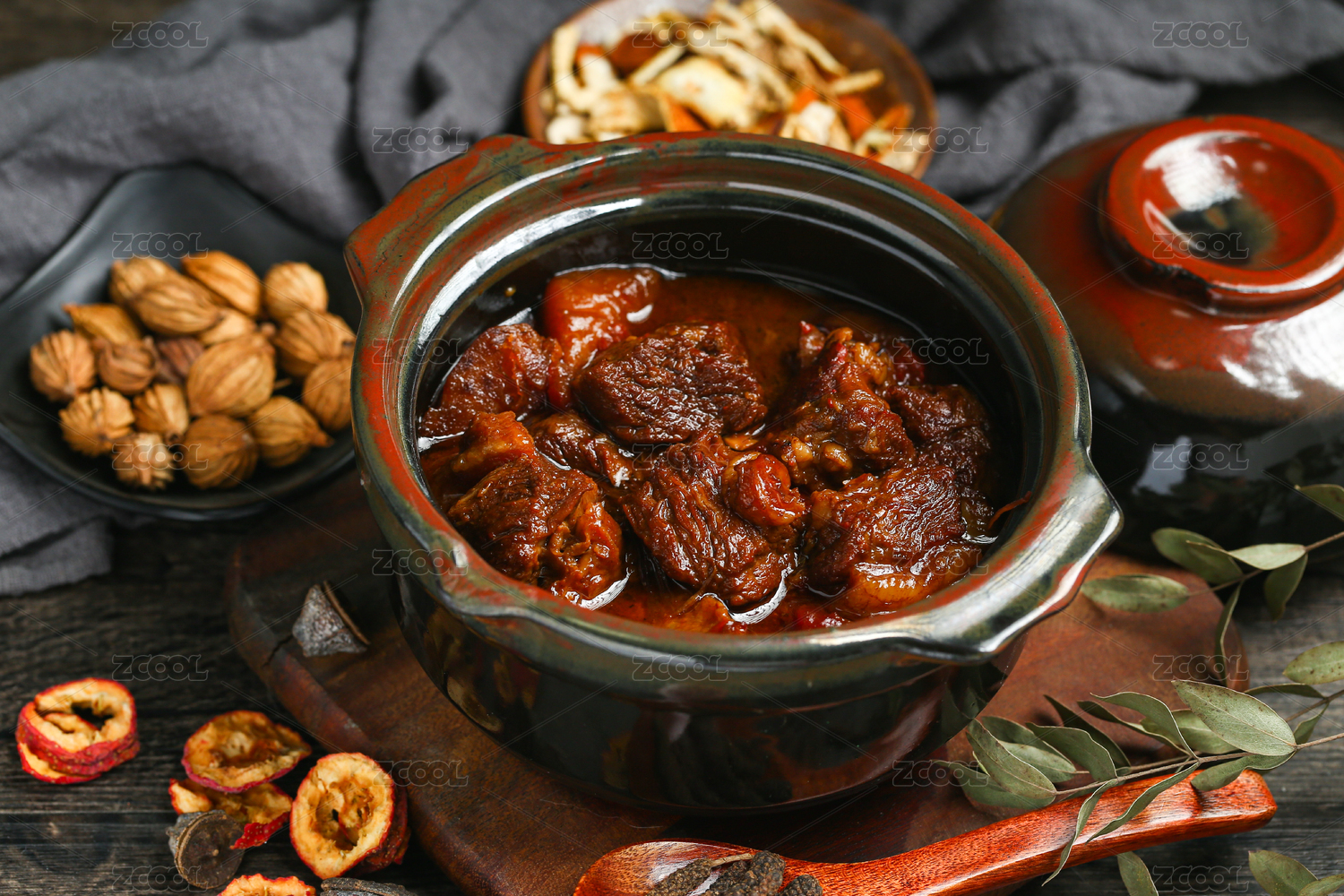 砂鍋里的燉牛肉和調(diào)料放在木板上