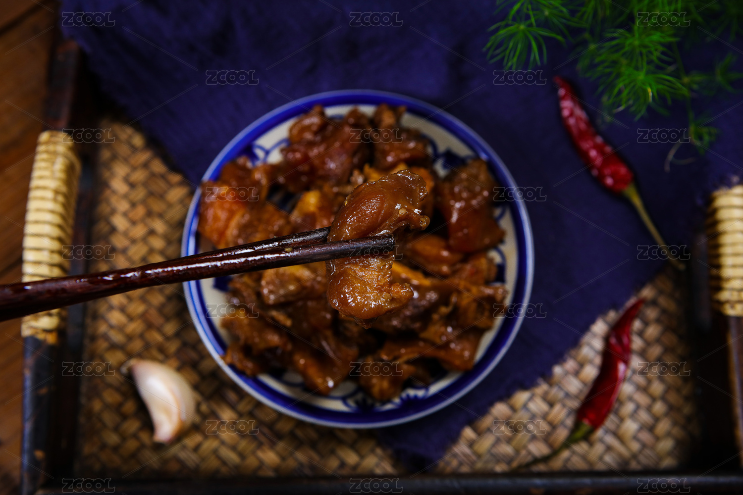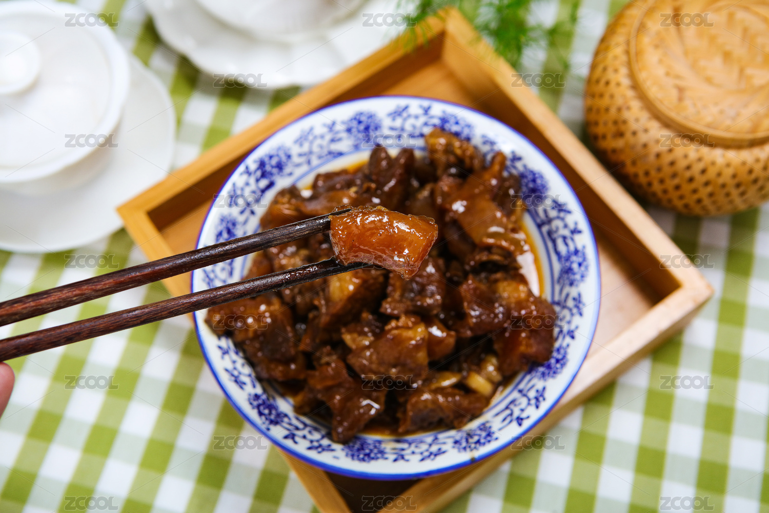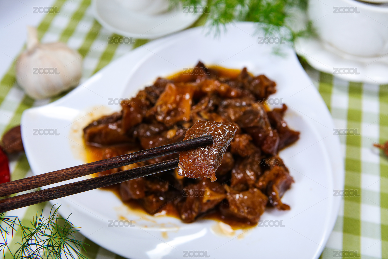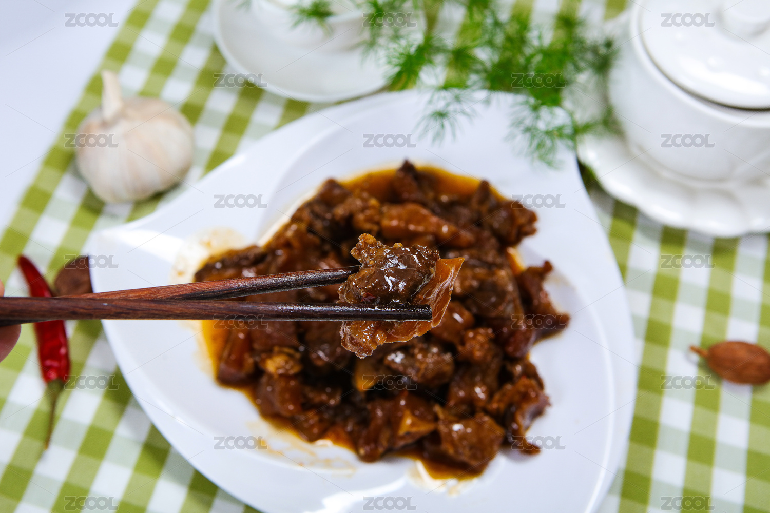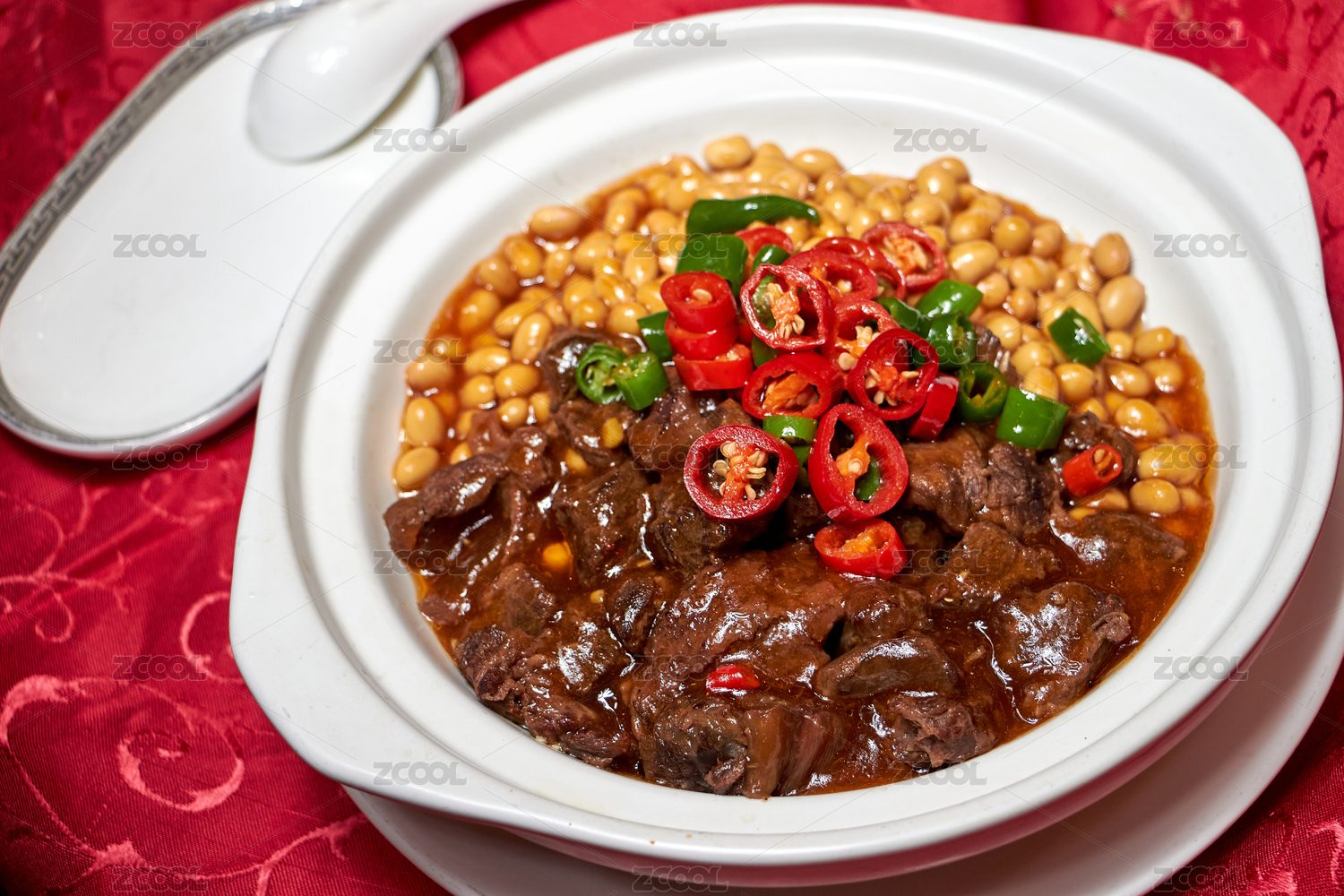 美味的家常菜黃豆燉牛肉盛放在白色的瓷碗里