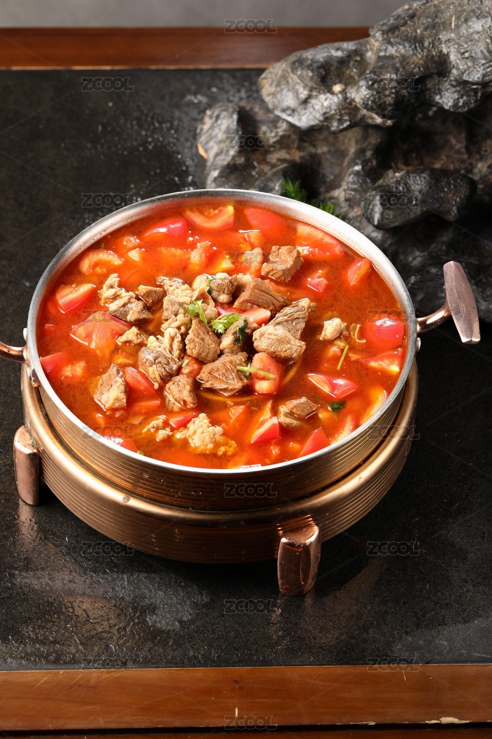 黑色桌子上的銅鍋西紅柿燉牛肉