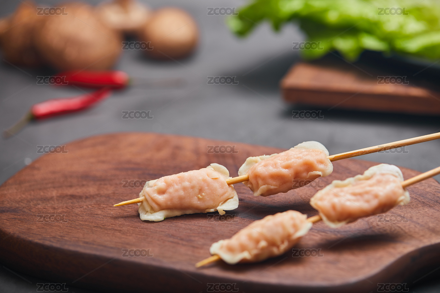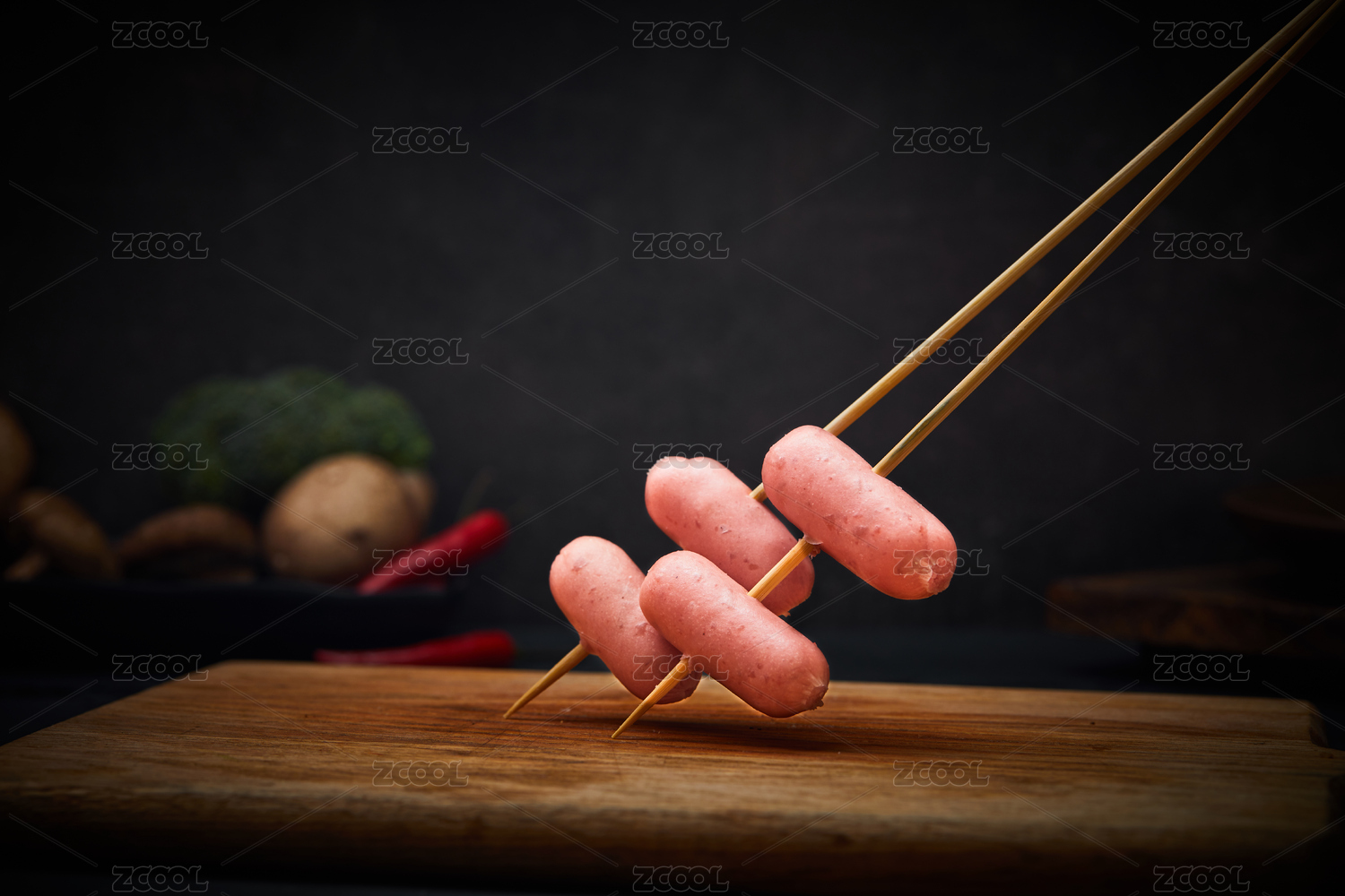 暗色桌面上的黑盤(pán)子里放著幾根烤脆皮腸