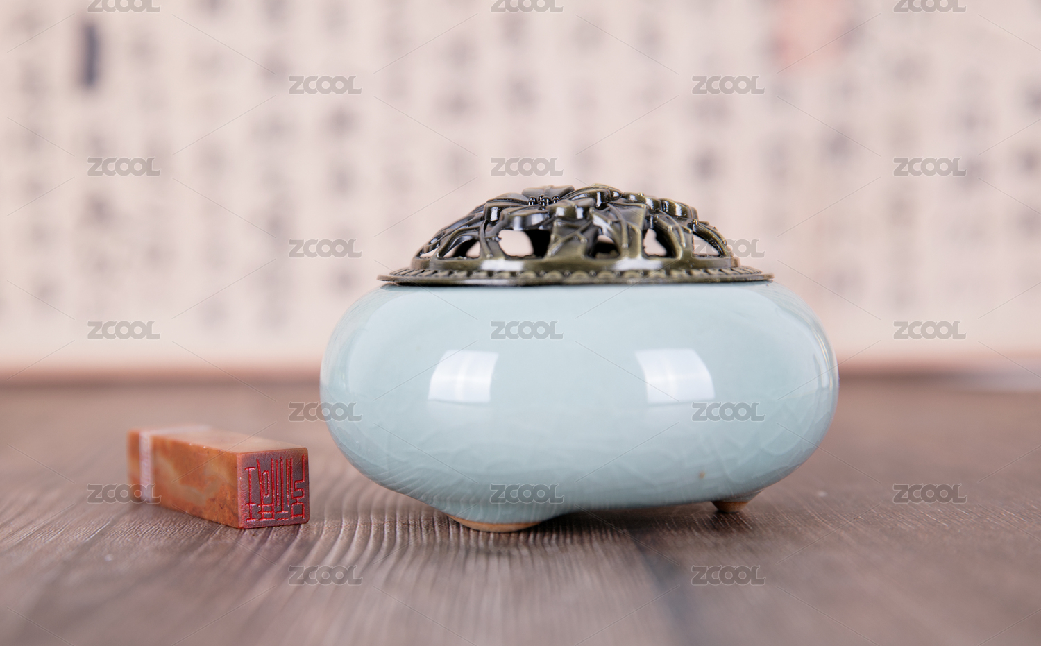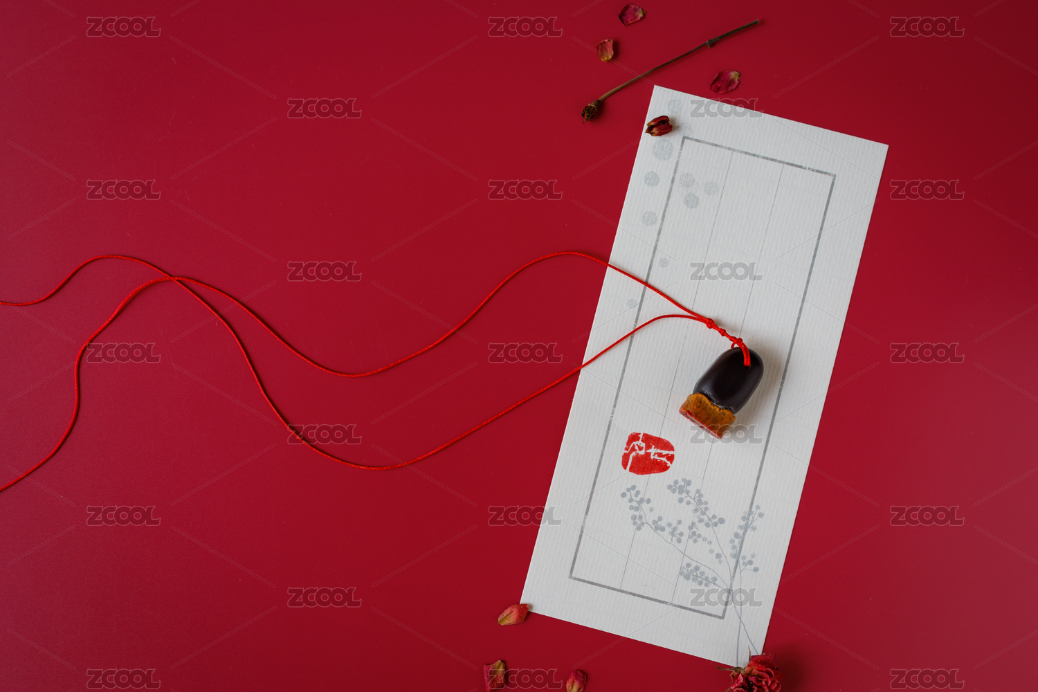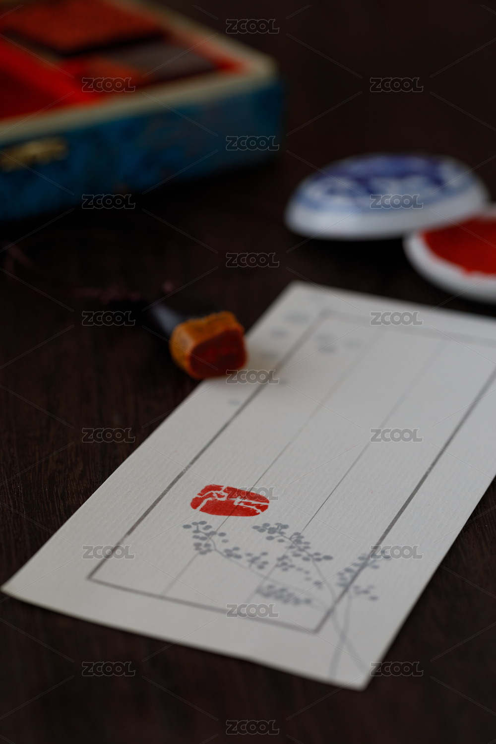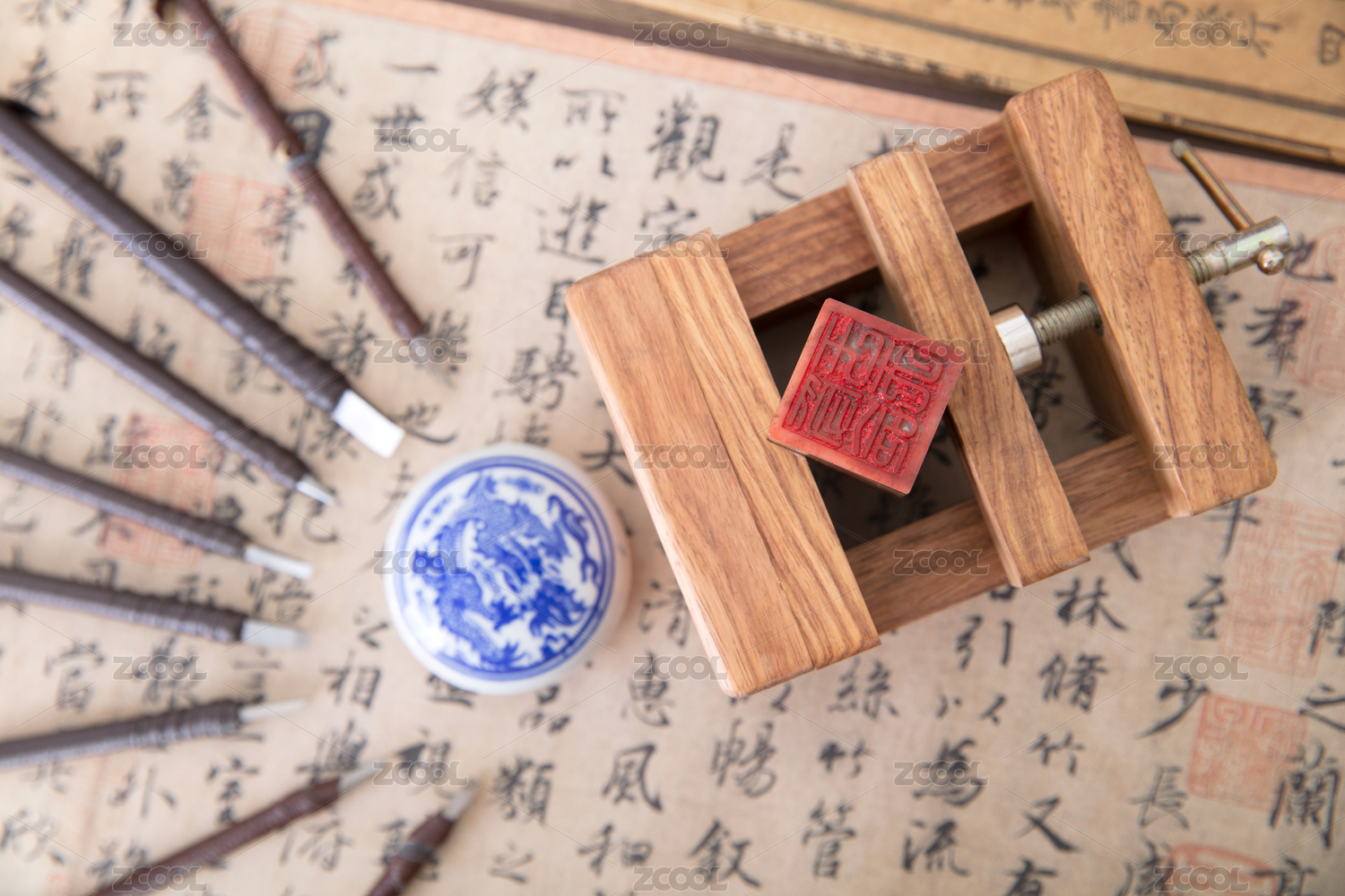 俯視拍攝中國(guó)書法背景上的印章和印泥