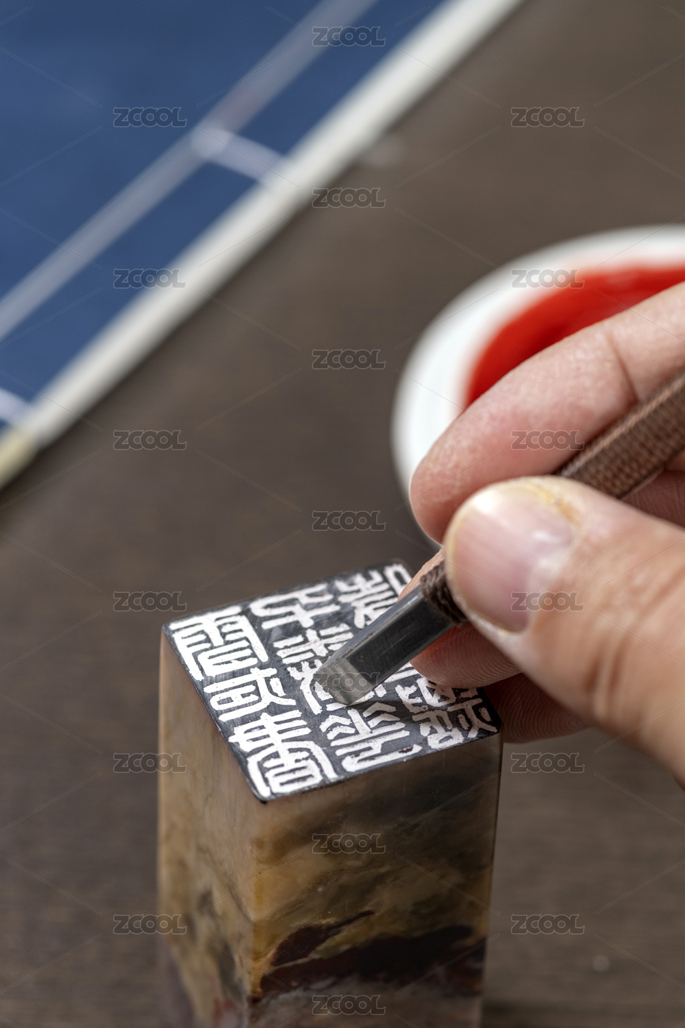 俯視拍攝固定在刻床上的印章和被一圈刻刀圍繞的印泥
