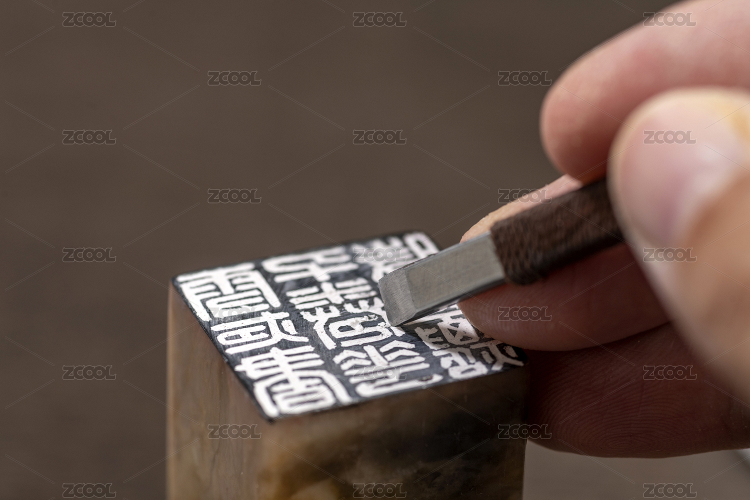 黑背景前雙手正在雕刻石獅子石貔貅印章鈕特寫