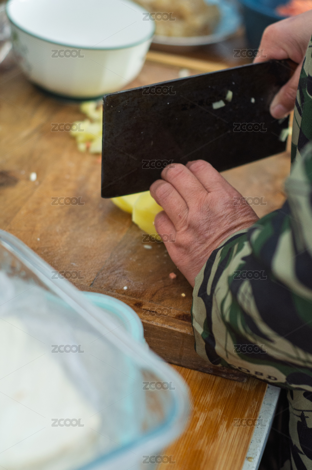 人手持菜刀在木砧板切菜