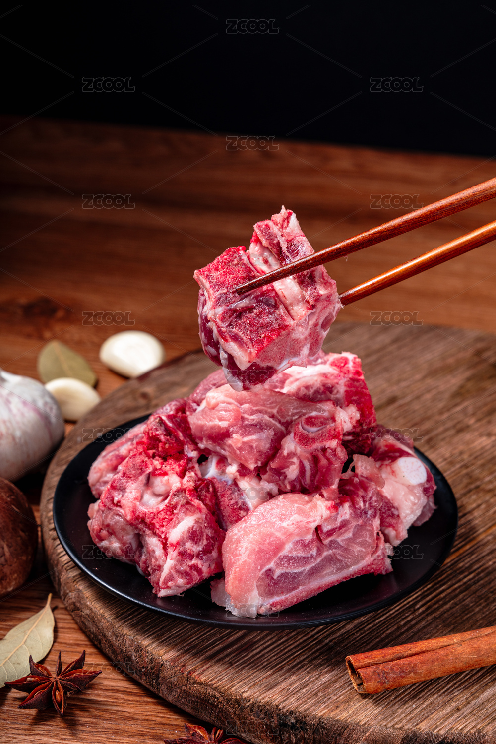 木砧板上盤子里用筷子夾起的湯骨