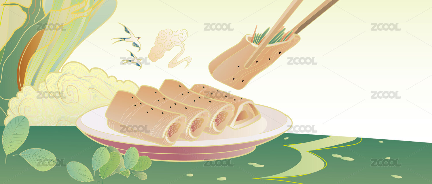 春卷食物國潮春天戶外矢量綠色葉子橫幅插畫