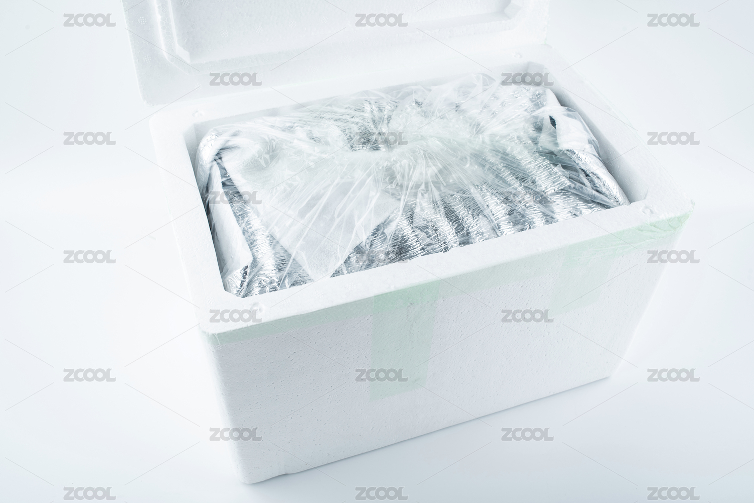 海鮮運(yùn)輸保溫包裝鋁膜袋和泡沫箱在白背景上