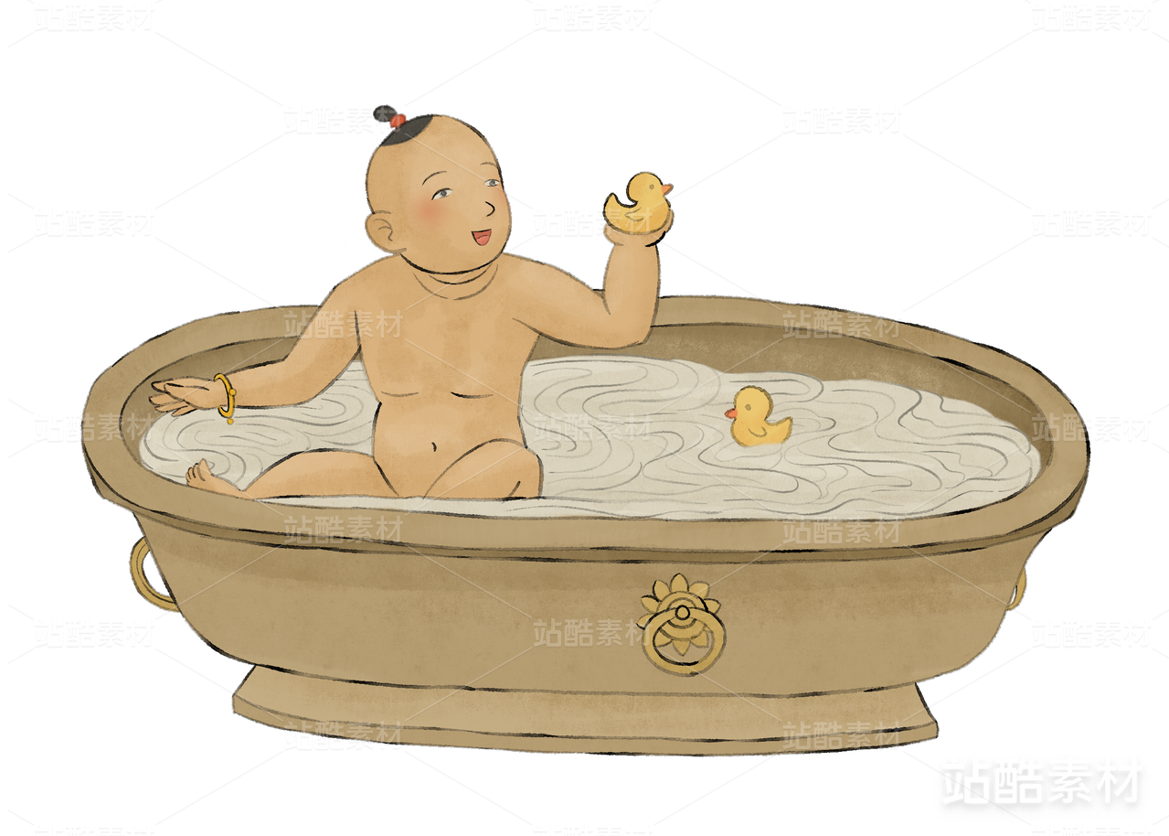 古代兒童在澡盆沐浴的工筆畫