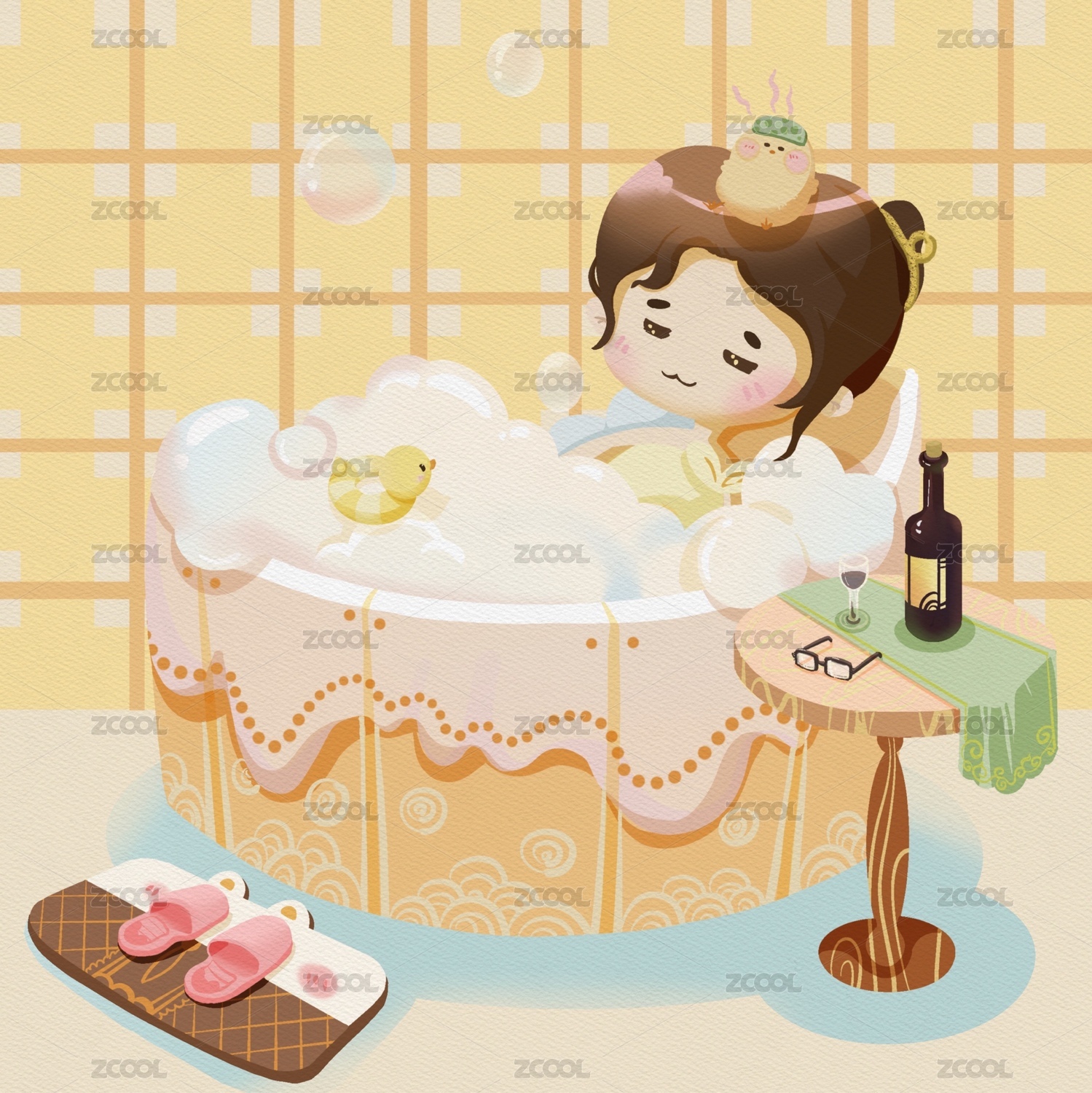 冬日泡澡治愈插畫