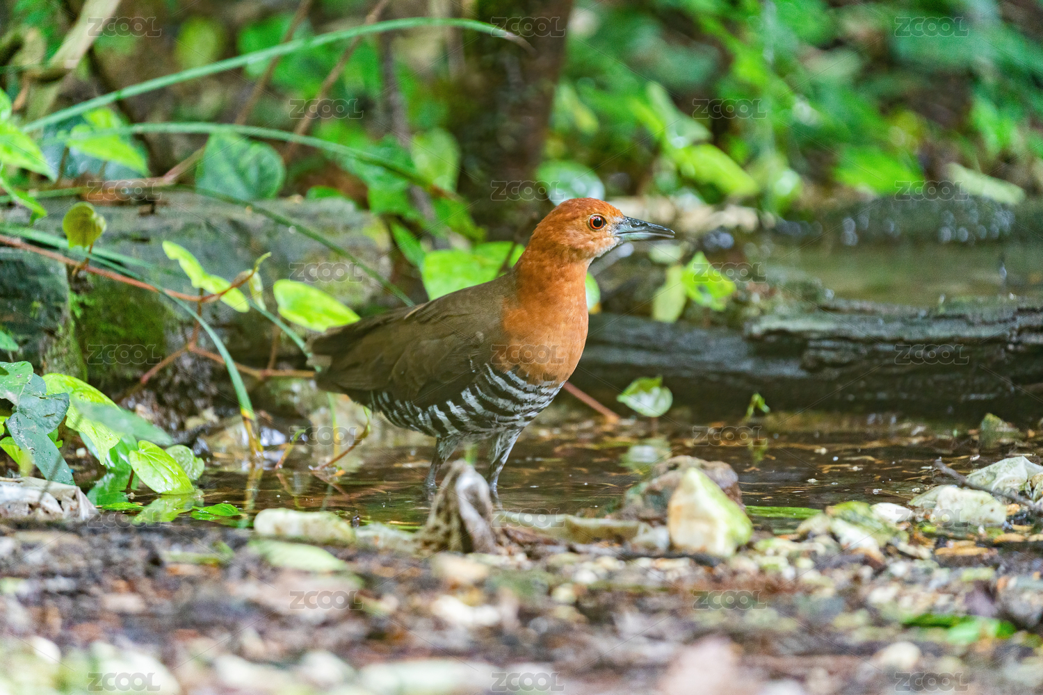 一只白喉斑秧雞在密林下的淺水塘里嬉戲沐浴