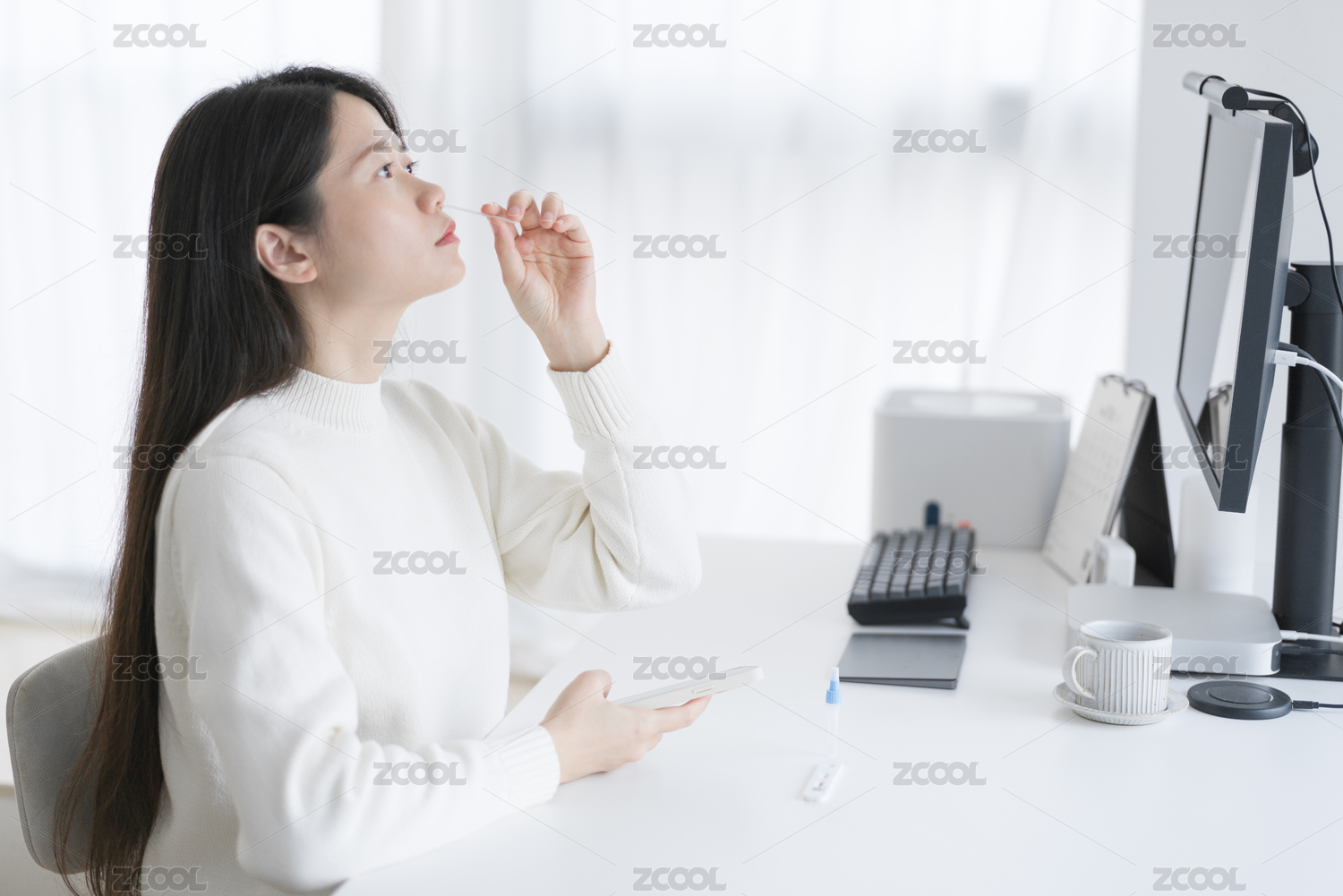 穿白色毛衣的女人在做鼻拭子核酸自測