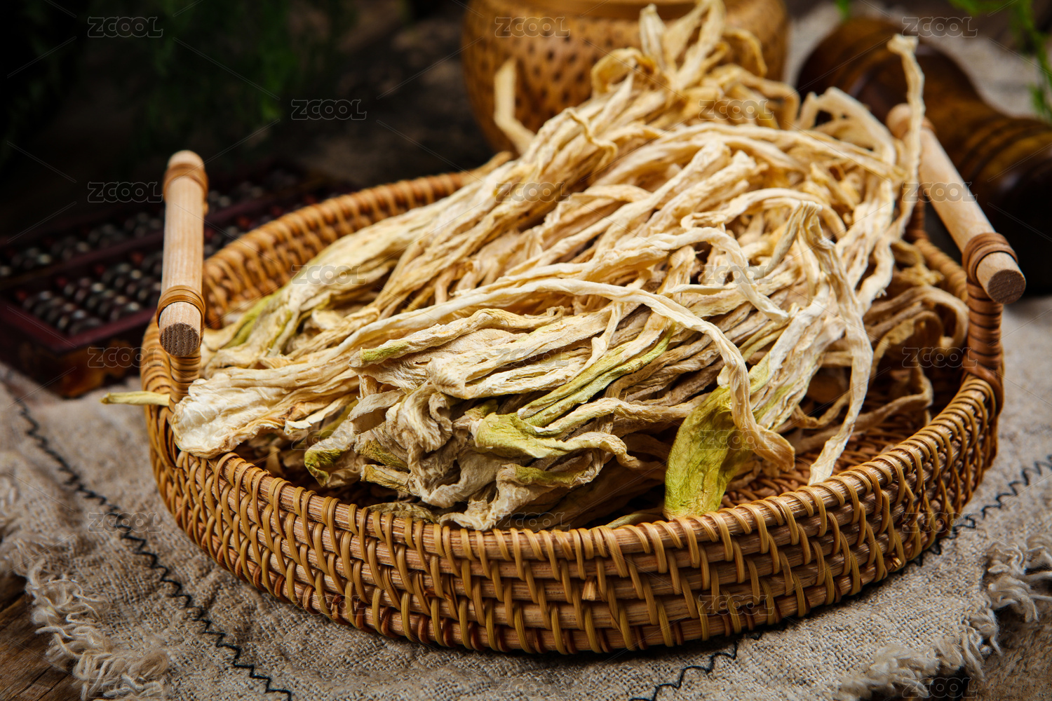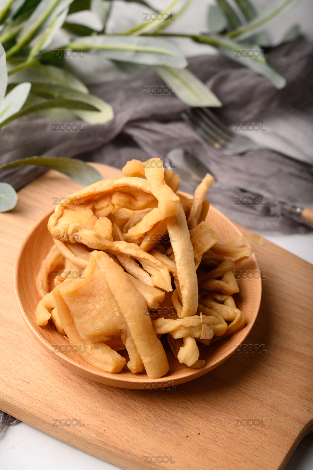 桌面上的木粘板上的木盤子里的蘿卜條干