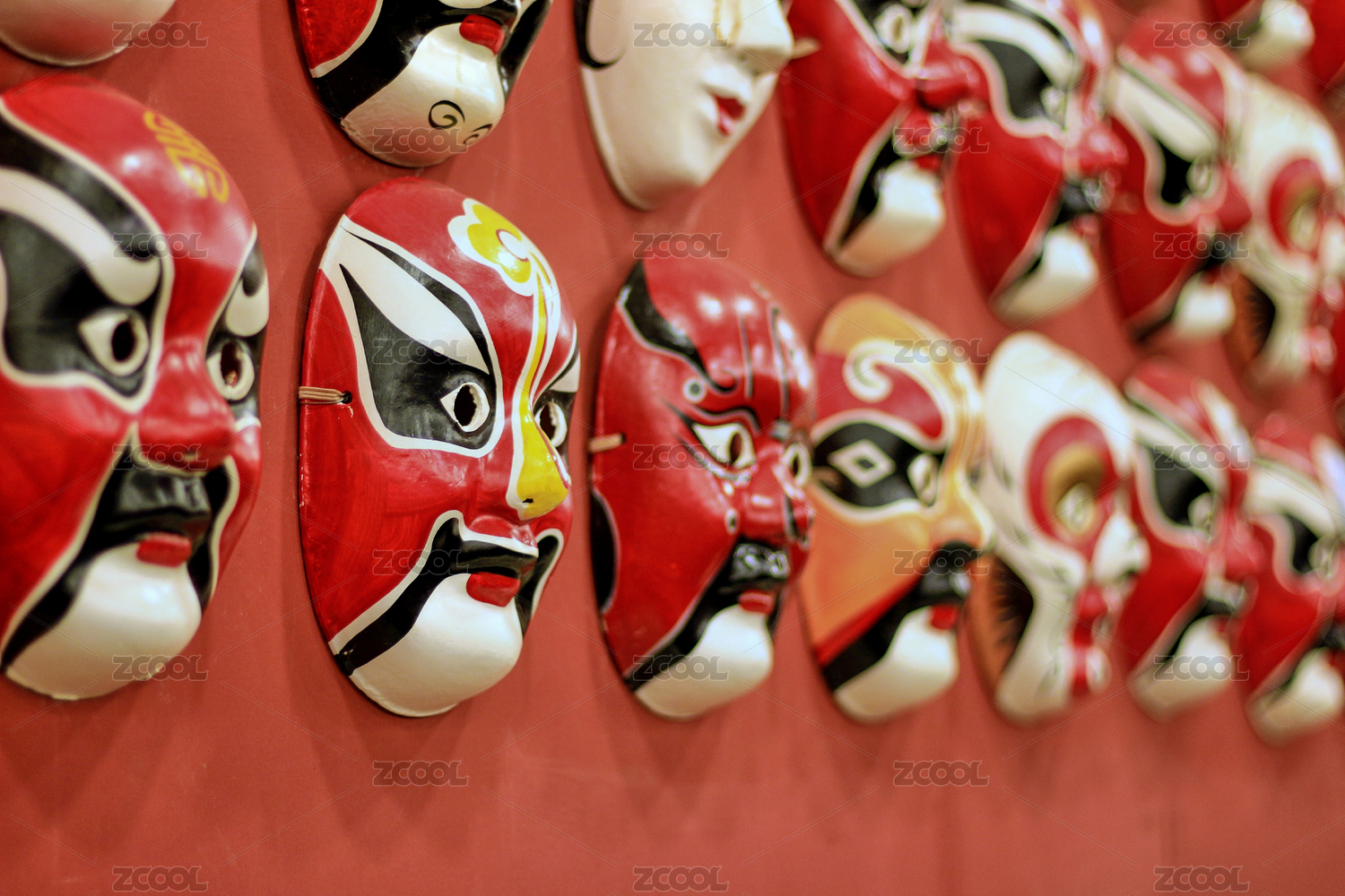 掛在紅色墻面上的中國川劇臉譜裝飾物