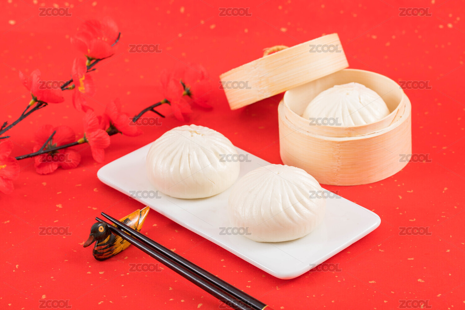 白盤里裝有包子及裝有包子的蒸籠和新年裝飾物品一同放在紅色灑金紙上