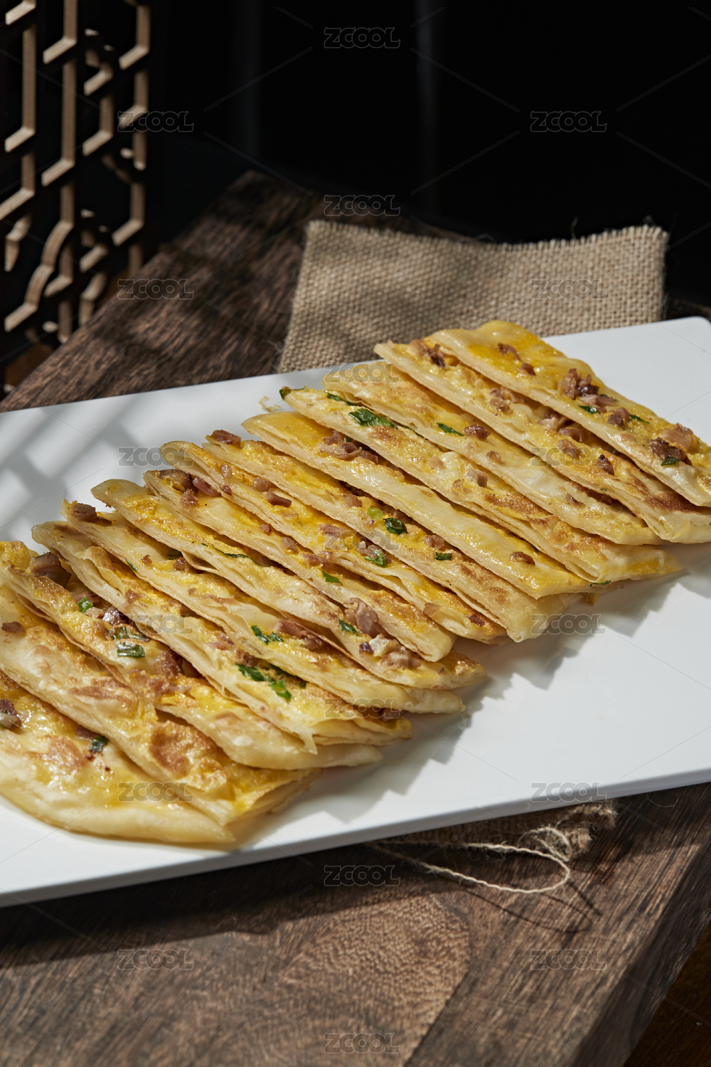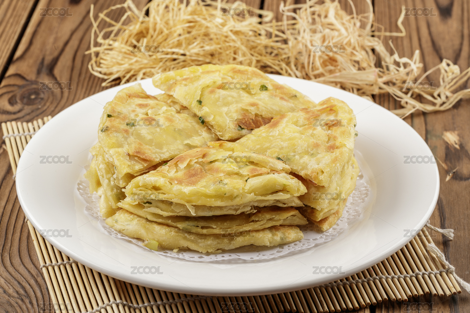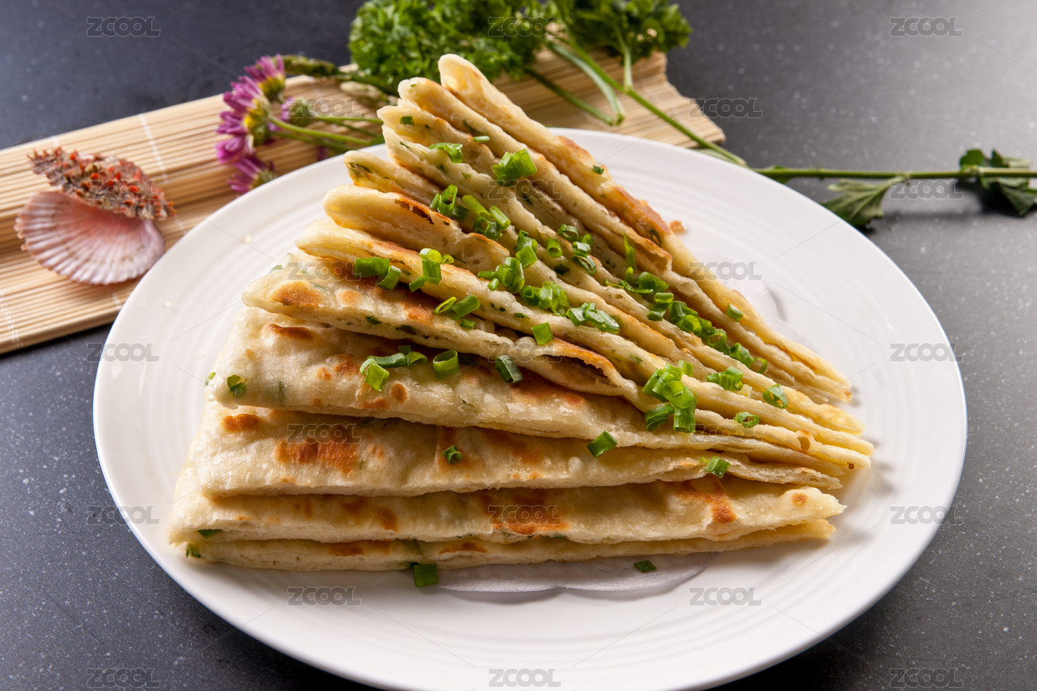 圓形白色瓷盤裝的蔥花餅擺放在壽司簾上