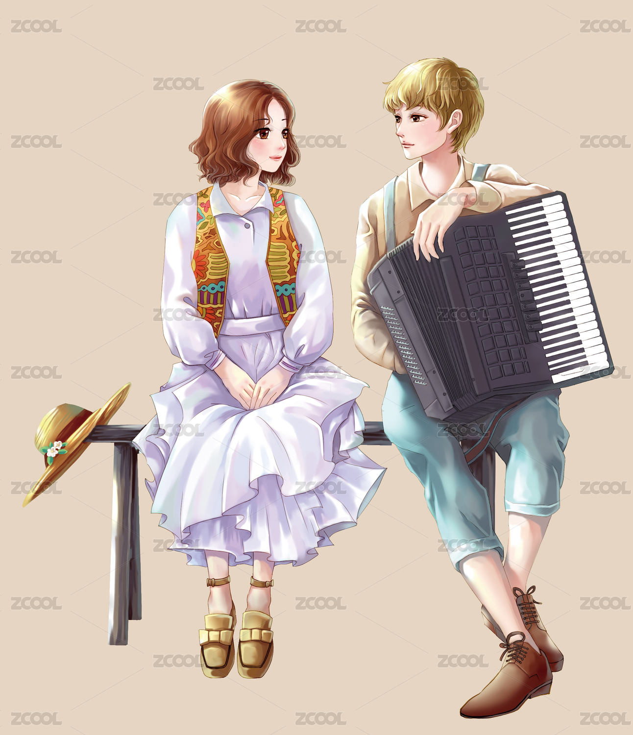 做在板凳上拉手風琴的少年和少女