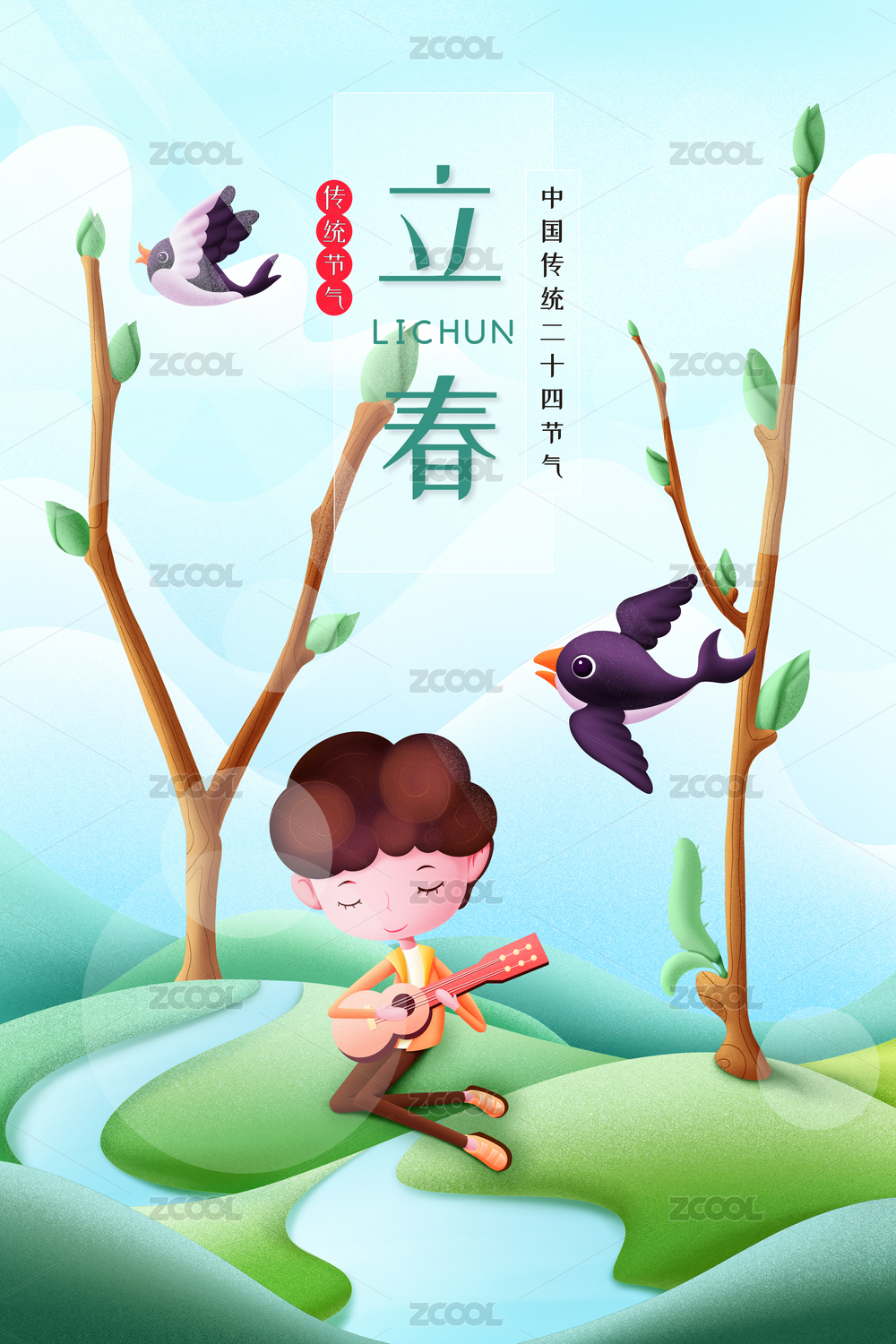 在春天的草地上談吉他的小男孩手繪插畫