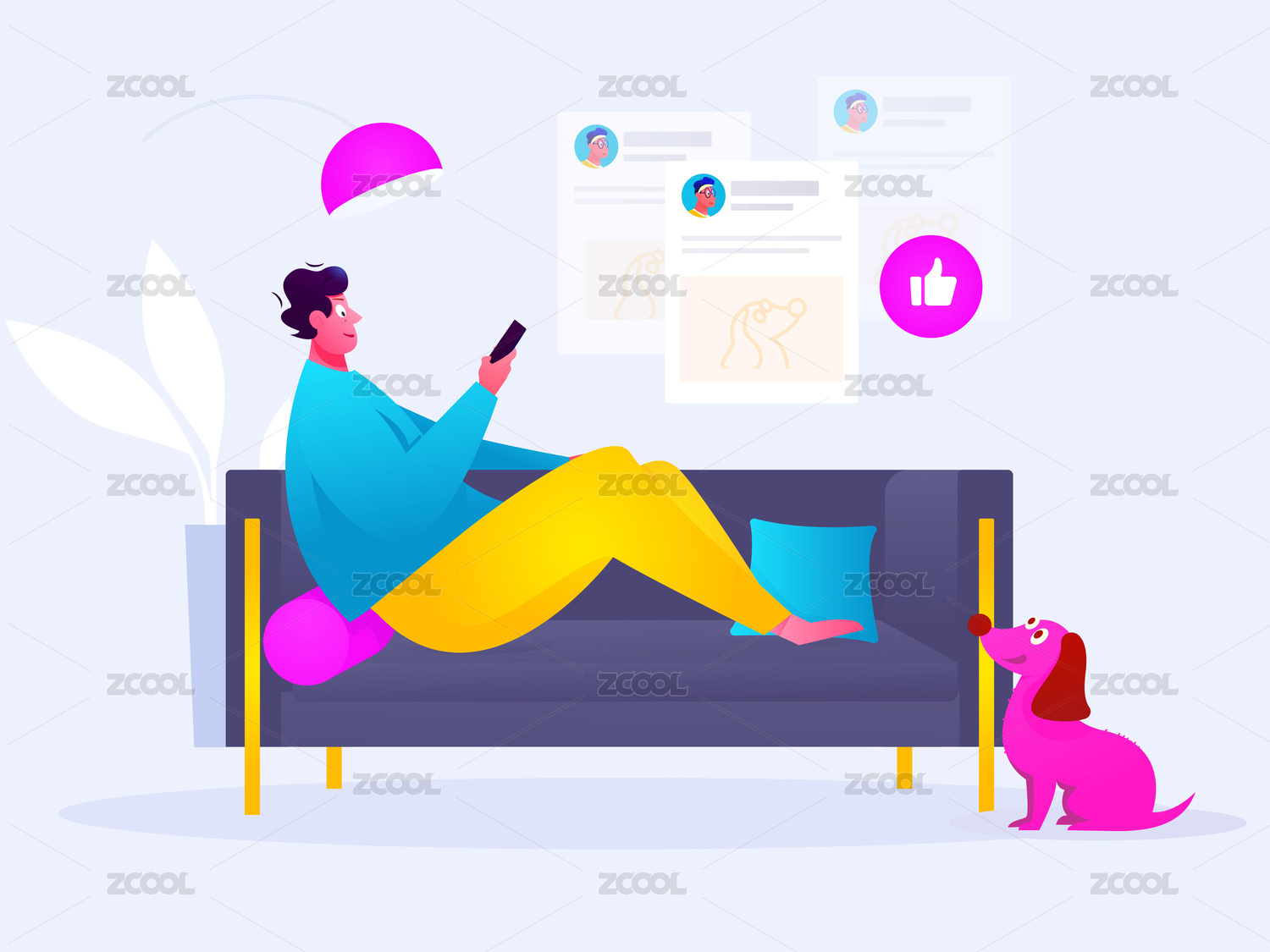在沙發(fā)上刷朋友圈查看發(fā)的照片獲得點贊數(shù),概念插畫