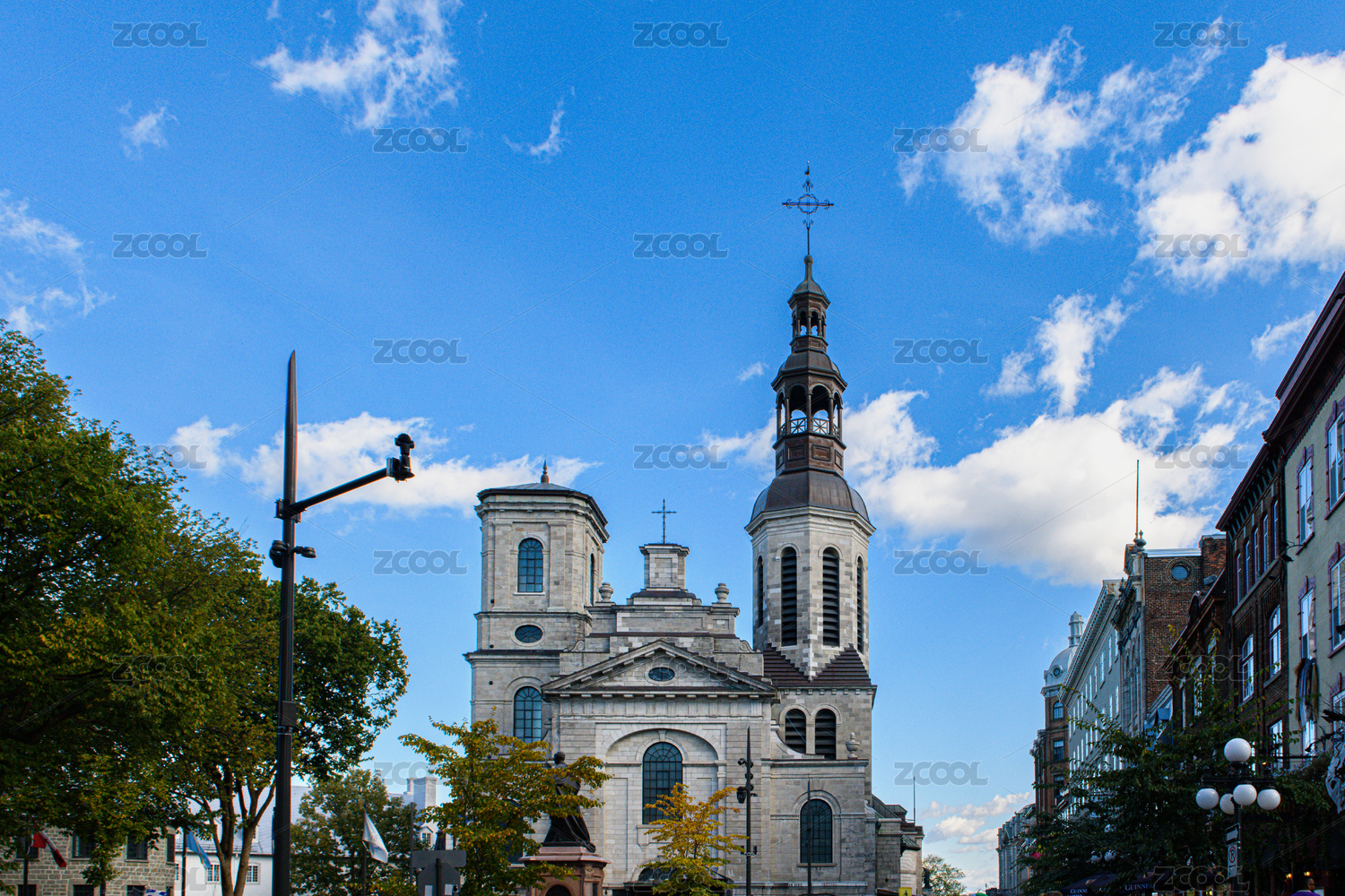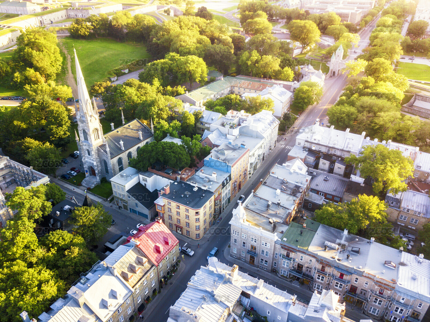 深秋加拿大魁北克街邊建筑物窗外的樹葉變成了金黃色