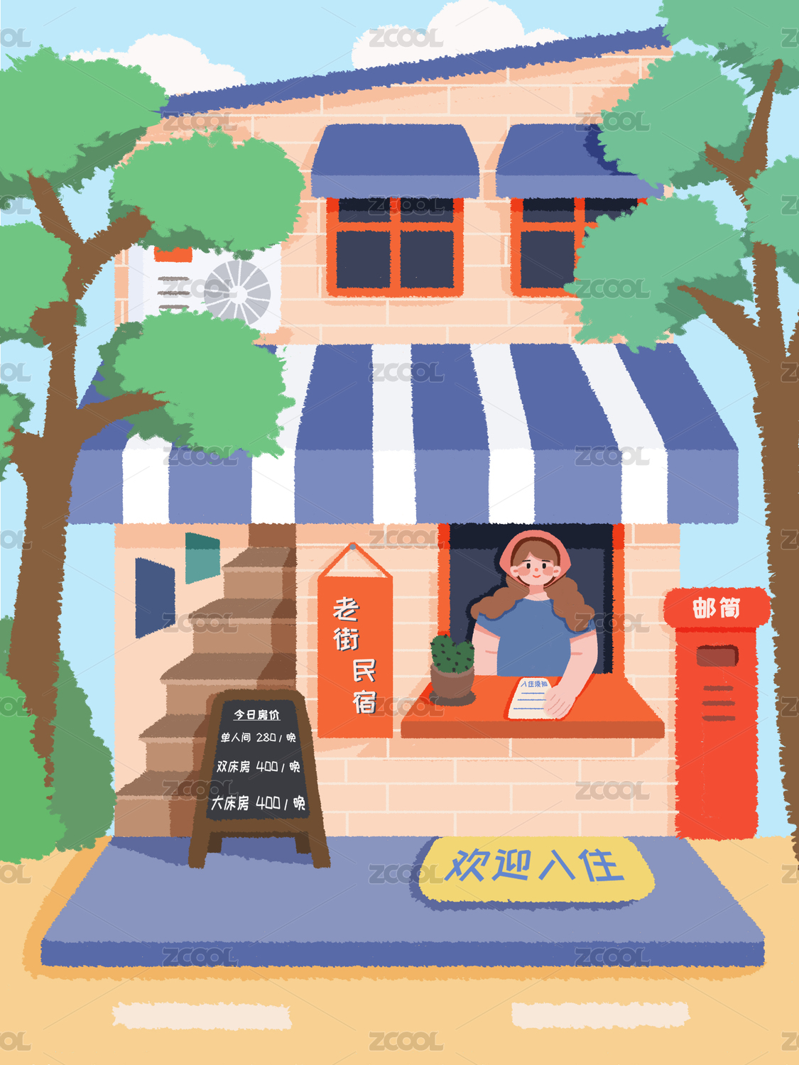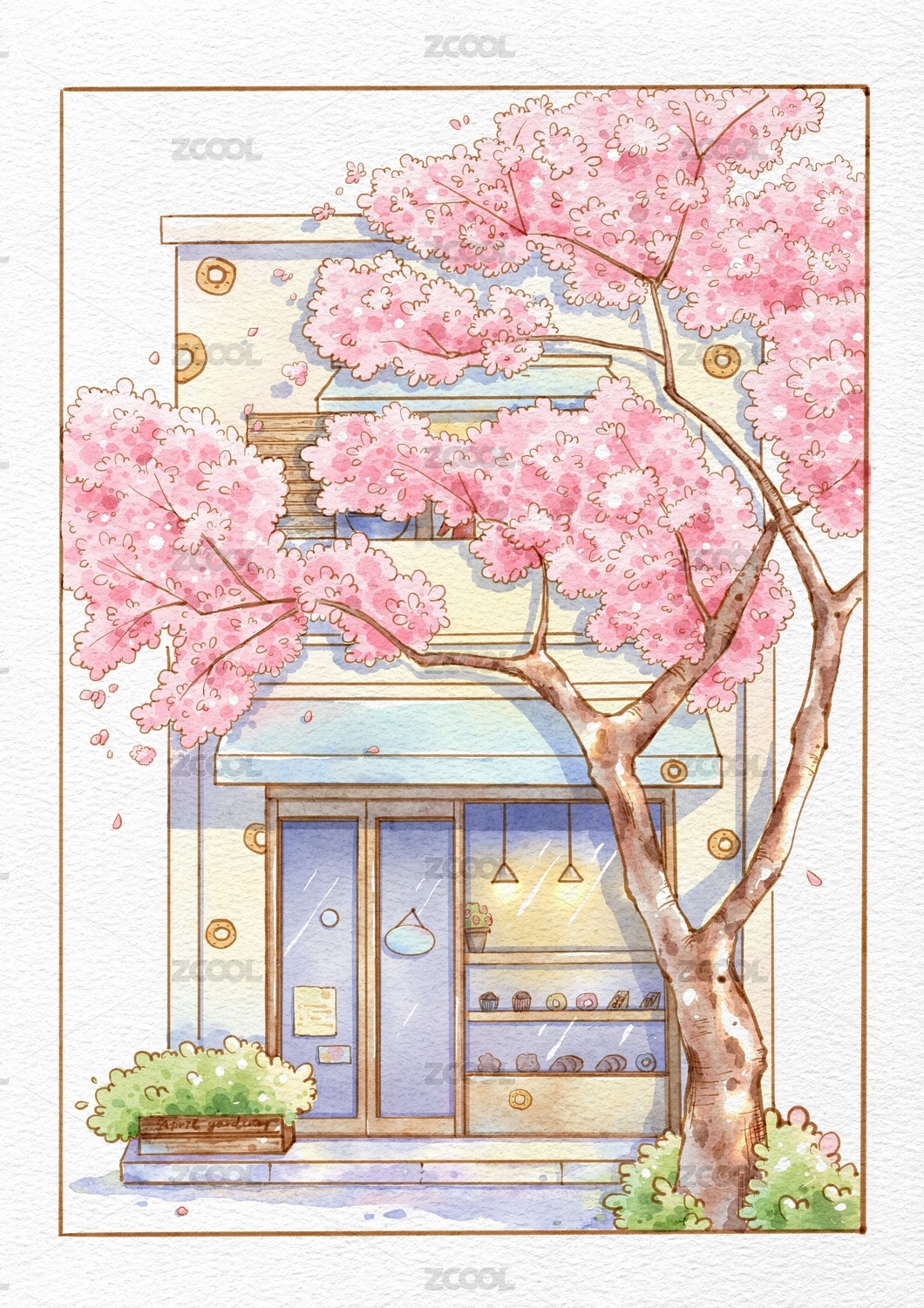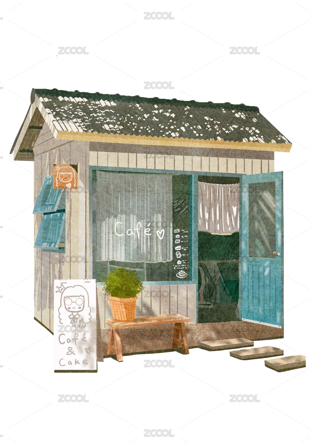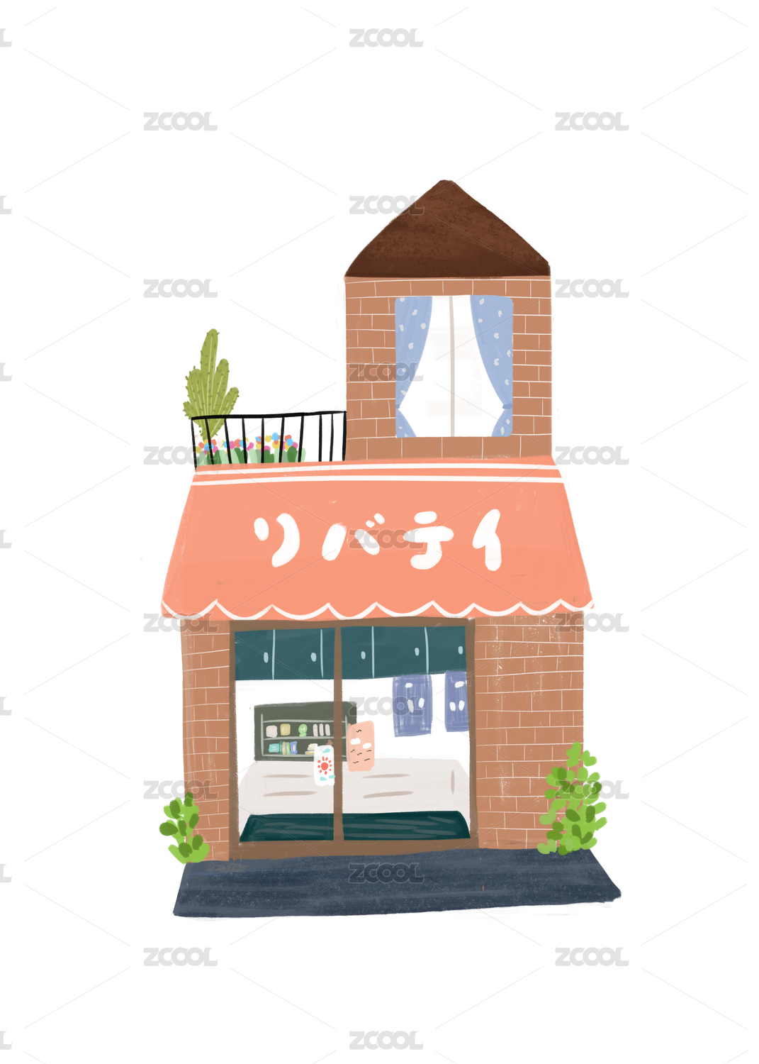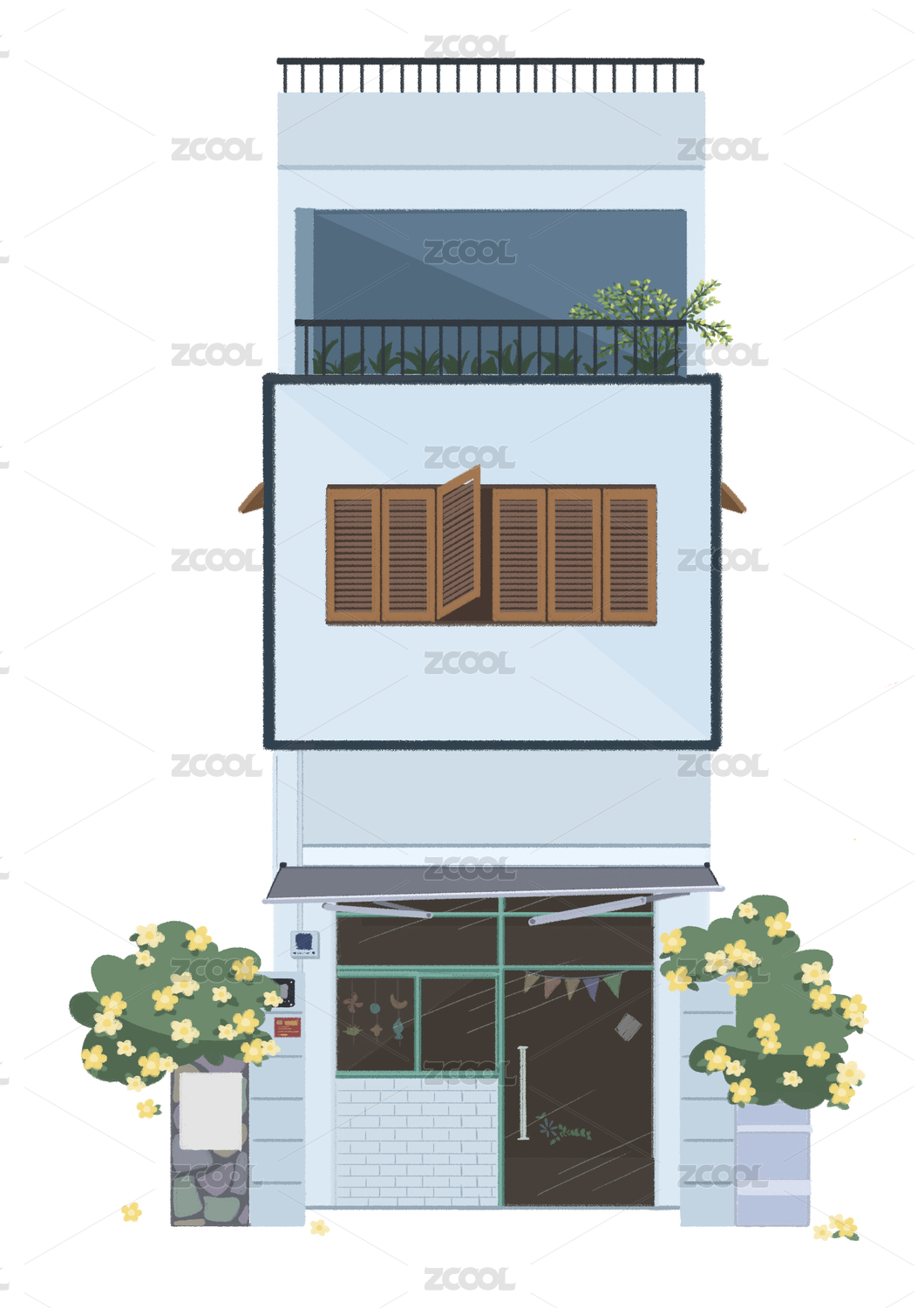 一間二層樓的文藝小店店鋪 水彩手繪插畫