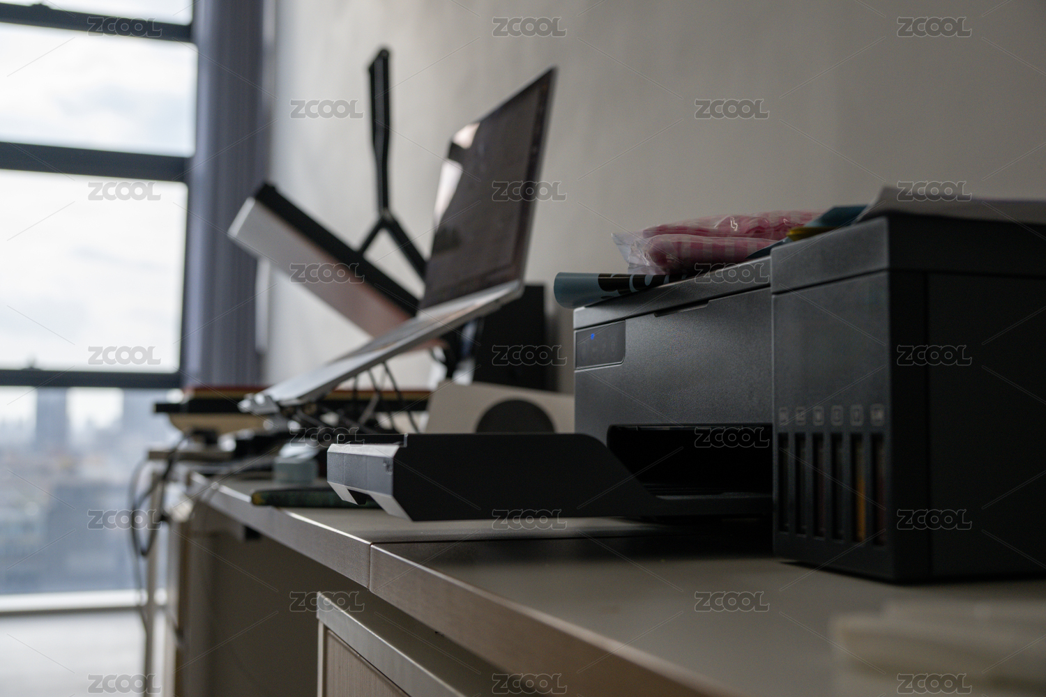 辦公桌上的打印機(jī)和筆記本電腦