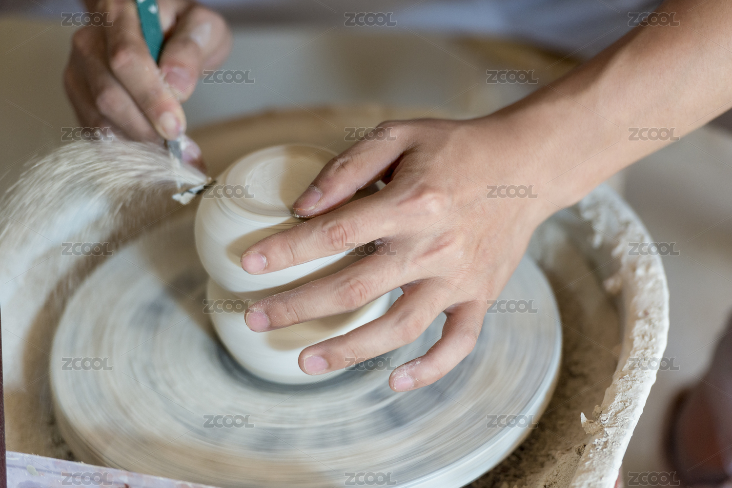 一雙手在制陶轉(zhuǎn)盤上對半成品進行拉胚整形