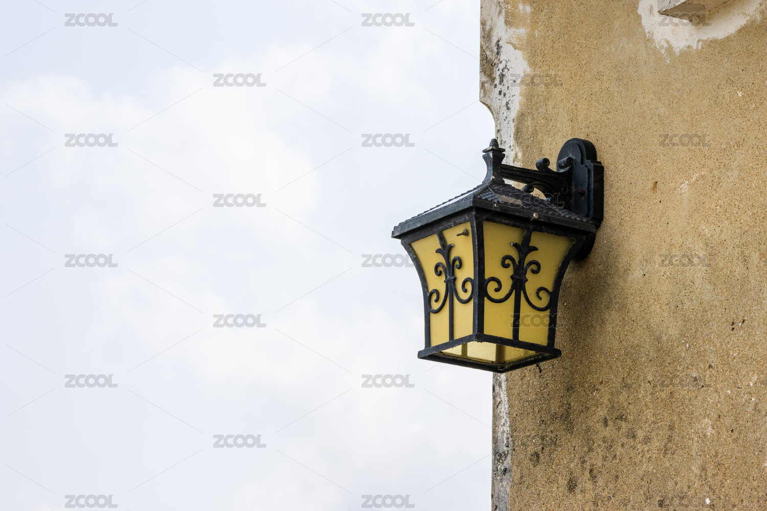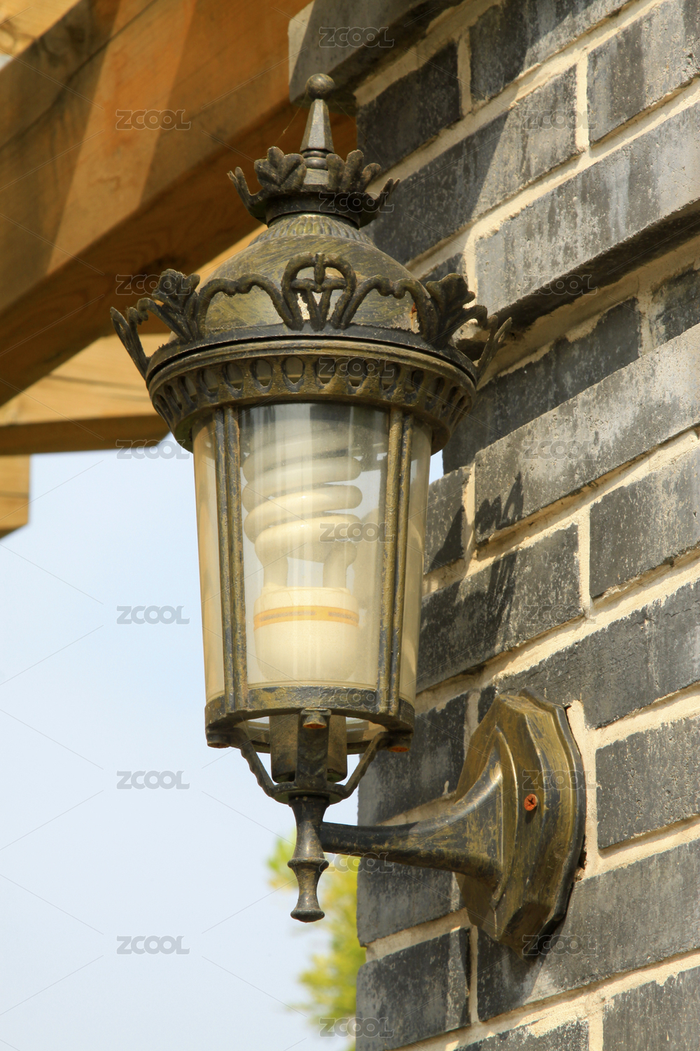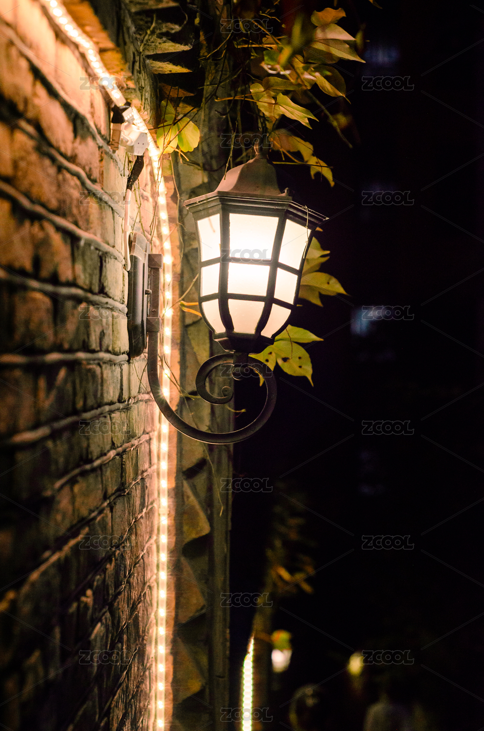 古色古香的磚墻上掛著一盞明亮的壁燈