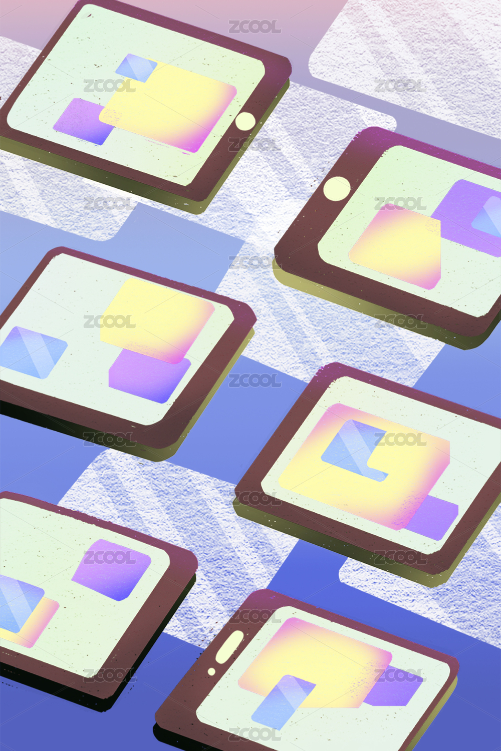 一堆平放著的手機(jī)平板屏幕,藍(lán)色調(diào)為主的,卡通風(fēng)格的科技插畫