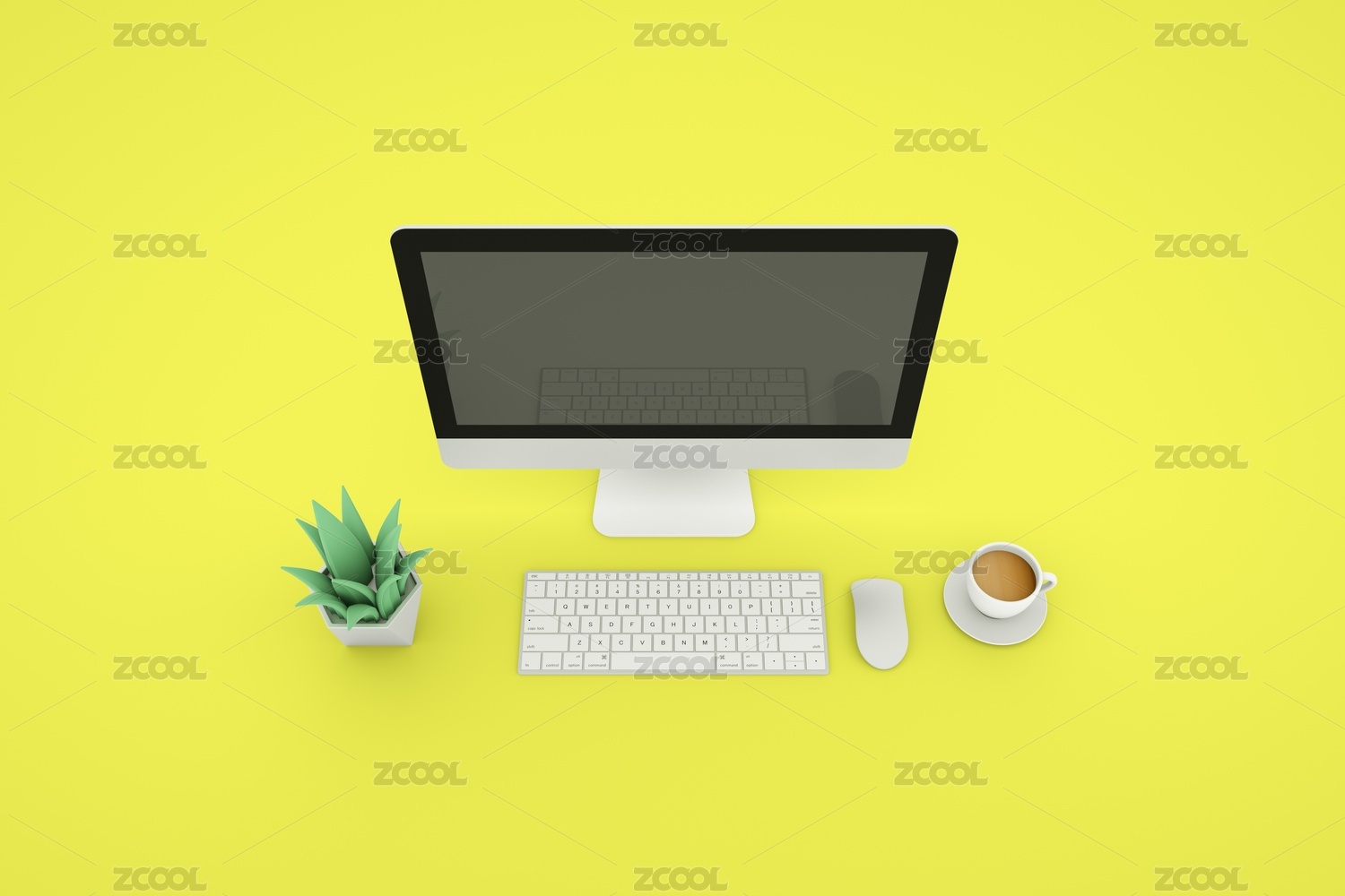 電腦顯示器、鍵盤、鼠標(biāo)、綠植和咖啡在桌上