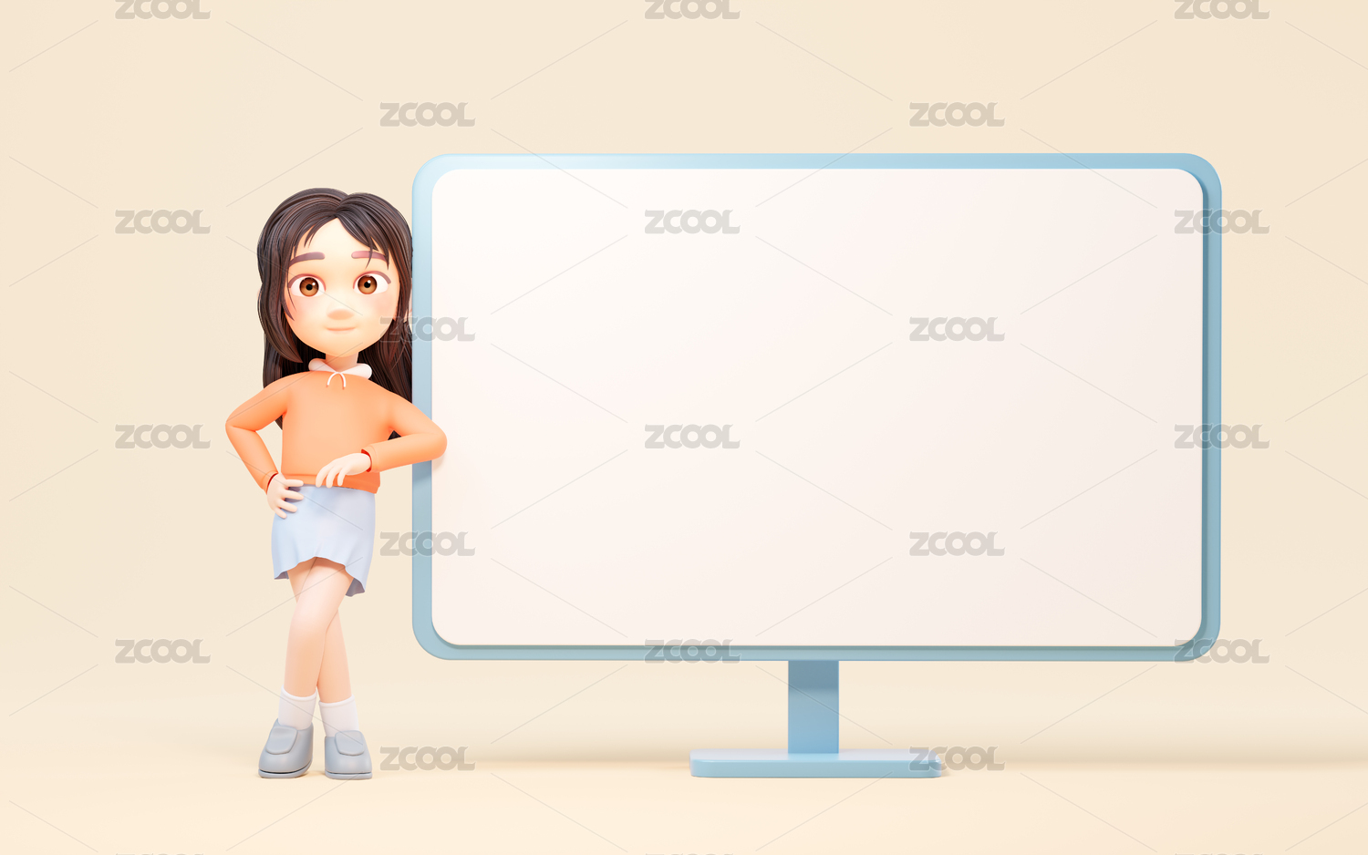 卡通女孩與顯示器3D渲染