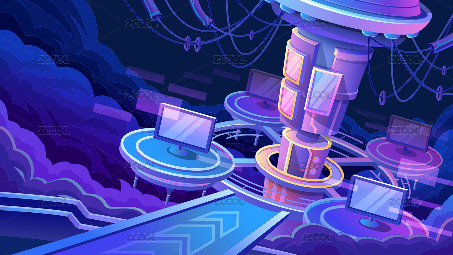 深藍(lán)紫色的科幻電腦顯示器信息數(shù)據(jù)空間場景