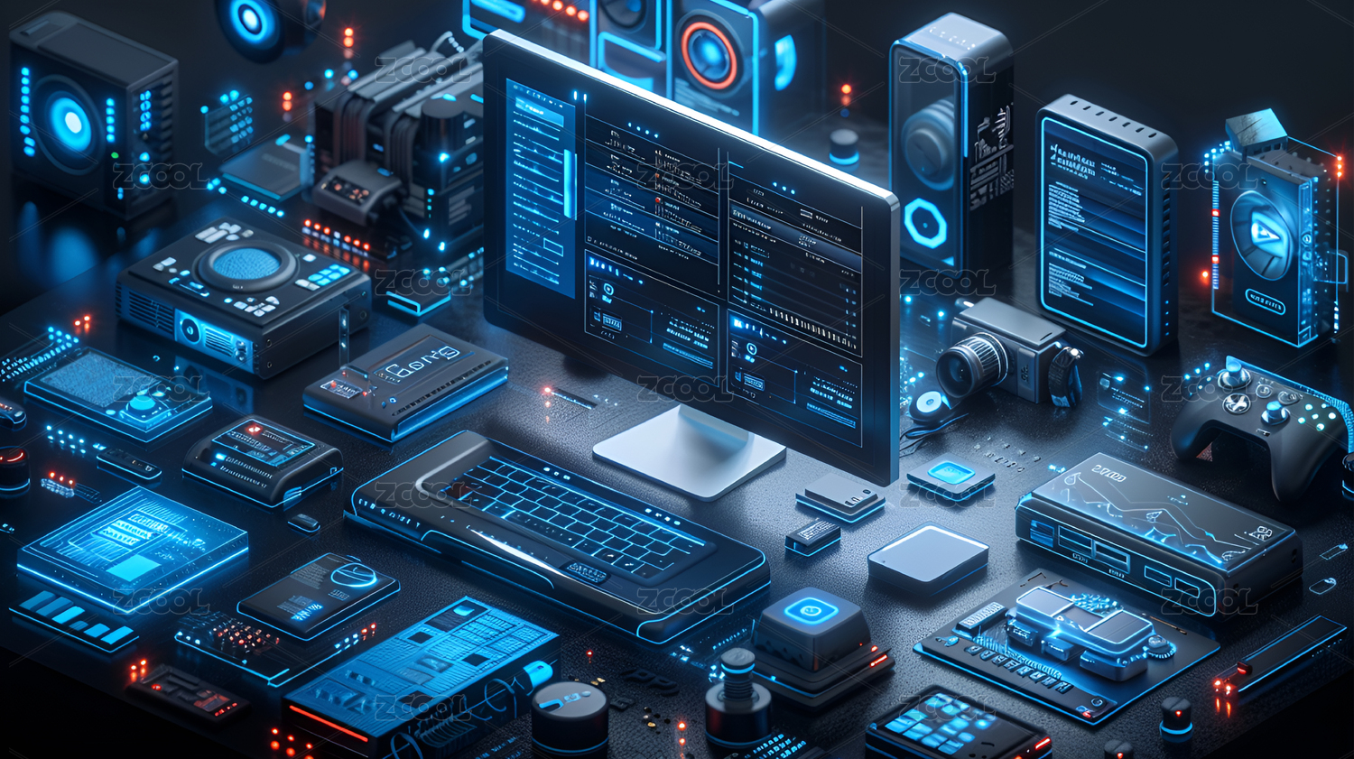 科技藍(lán)透光玻璃電腦顯示器屏幕設(shè)備智能概念