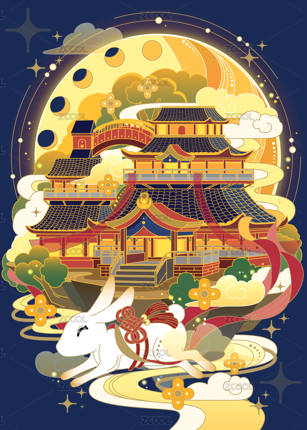 中秋節(jié)中國風(fēng)月餅兔子滿月桂花古建筑節(jié)日模板