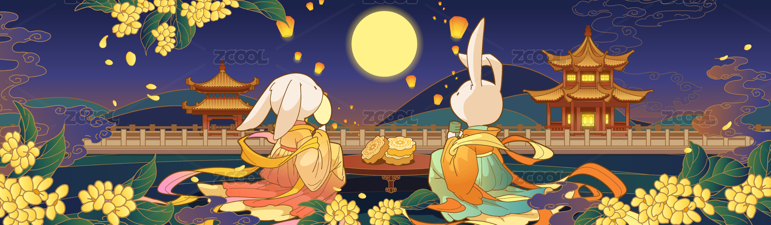 中秋兔子賞月桂花國風(fēng)月餅祥云夜景橫構(gòu)圖