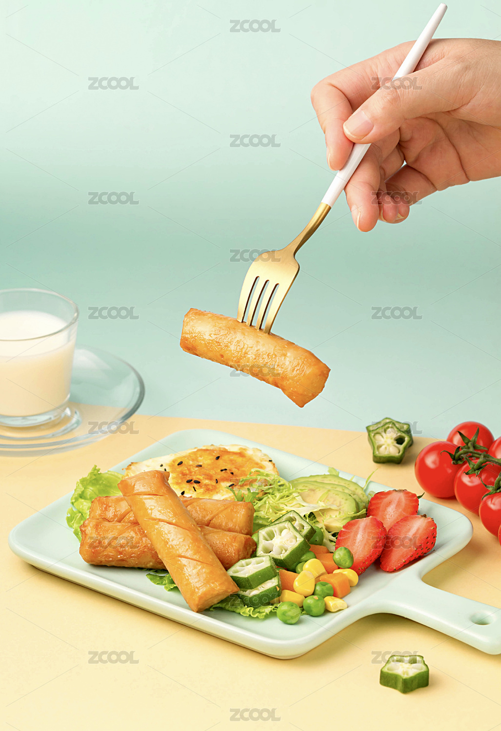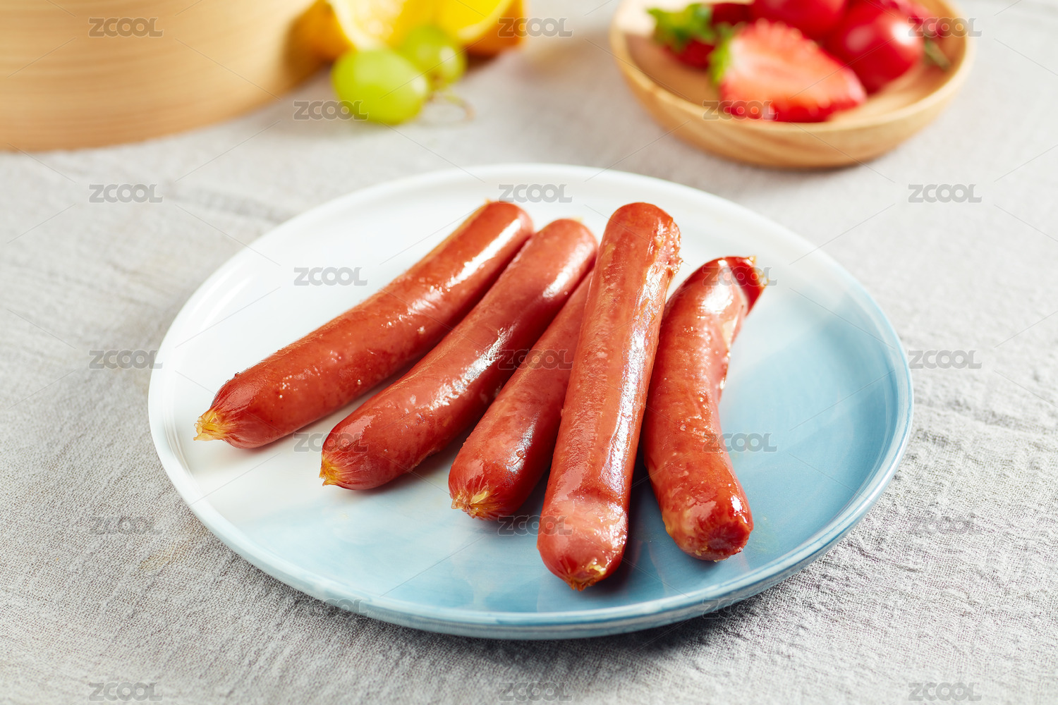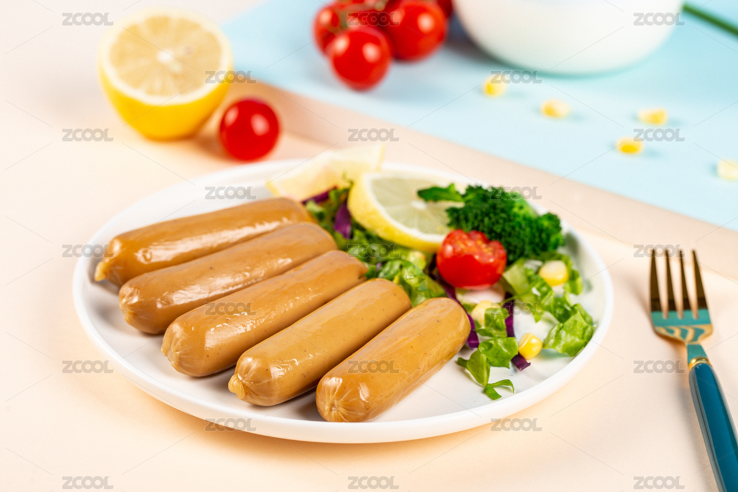 叉子叉起藍色盤子里的一根雞肉腸