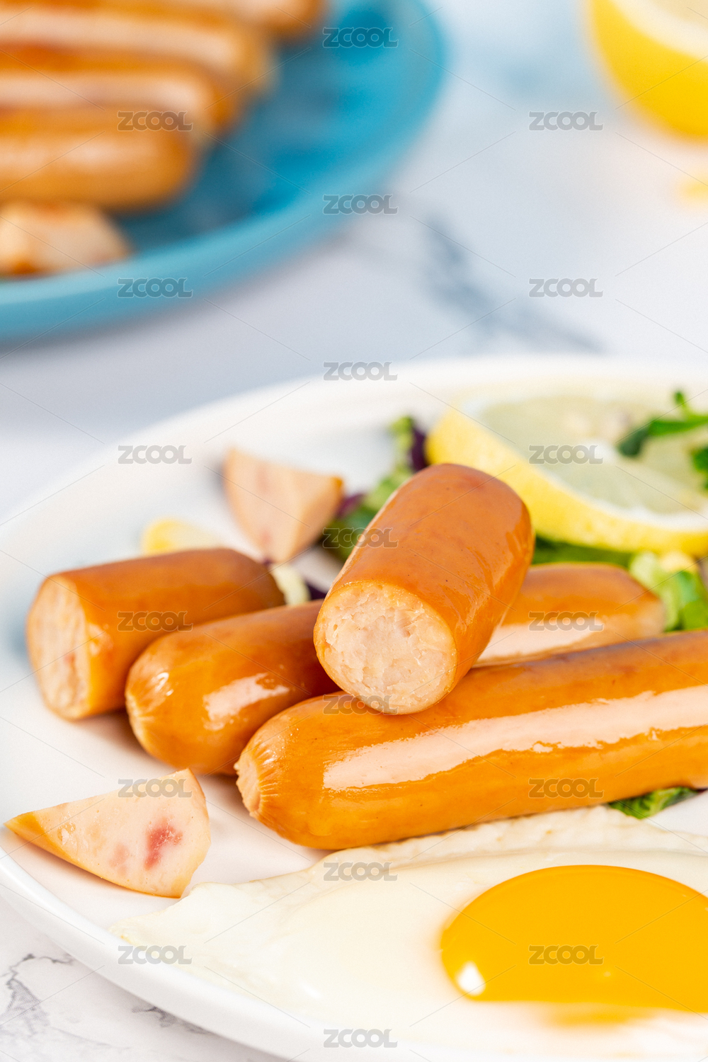 藍色背景上掰開的雞肉腸